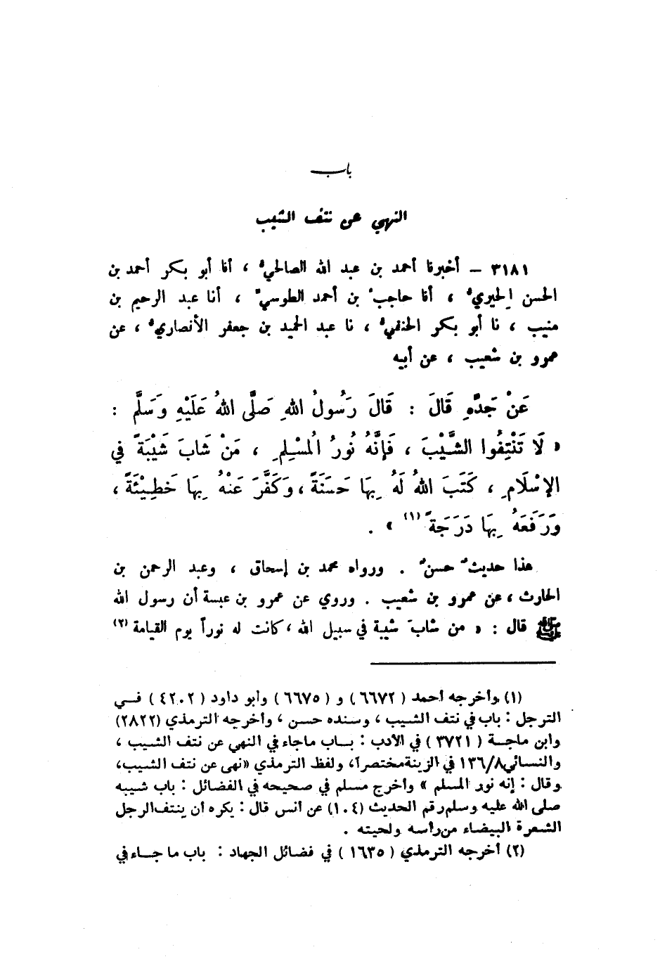 3181 - أَخْبَرَنَا أَحْمَدُ بْنُ عَبْدِ اللَّهِ الصَّالِحِيُّ، أَنا أَبُو بَكْرٍ أَحْمَدُ بْنُ الْحَسَنِ الْحِيرِيُّ، أَنا حَاجِبُ بْنُ أَحْمَدَ الطُّوسِيُّ، أَنا عَبْدُ الرَّحِيمِ بْنُ مُنِيبٍ، نَا أَبُو بَكْرٍ الْحَنَفِيُّ، نَا عَبْدُ الْحَمِيدِ بْنُ جَعْفَرٍ الأَنْصَارِيُّ، عَنْ عَمْرِو بْنِ شُعَيْبٍ، عَنْ أَبِيهِ، عَنْ جَدِّهِ، قَالَ: قَالَ رَسُولُ اللَّهِ صَلَّى اللهُ عَلَيْهِ وَسَلَّمَ: «لَا تَنْتِفُوا الشَّيْبَ، فَإِنَّهُ نُورُ الْمُسْلِمِ، مَنْ شَابَ شَيْبَةً فِي الإِسْلامِ، كَتَبَ اللَّهُ لَهُ بِهَا حَسَنَةً، وَكَفَّرَ عَنْهُ بِهَا خَطِيئَةً، وَرَفَعَهُ بِهَا دَرَجَةً».