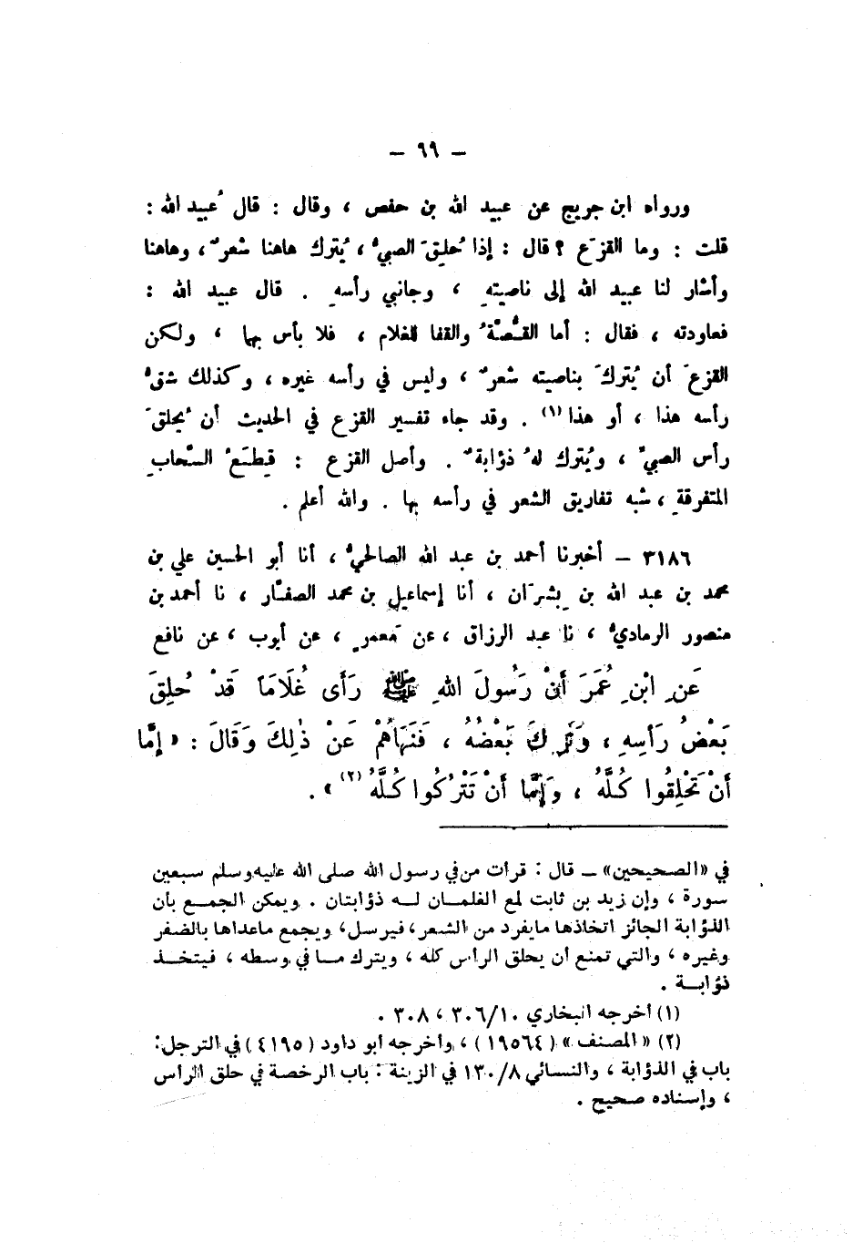 3186 - أَخْبَرَنَا أَحْمَدُ بْنُ عَبْدِ اللَّهِ الصَّالِحِيُّ، أَنا أَبُو الْحُسَيْنِ عَلِيُّ بْنُ مُحَمَّدِ بْنِ عَبْدِ اللَّهِ بْنِ بِشرَانَ، أَنا إِسْمَاعِيلُ بْنُ مُحَمَّدٍ الصَّفَّارُ، نَا أَحْمَدُ بْنُ مَنْصُورٍ الرَّمَادِيُّ، نَا عَبْدُ الرَّزَّاقِ، عَنْ مَعْمَرٍ، عَنْ أَيُّوبَ، عَنْ نَافِعٍ، عَنِ ابْنِ عُمَرَ، " أَنْ رَسُولَ اللَّهِ صَلَّى اللهُ عَلَيْهِ وَسَلَّمَ رَأَى غُلامًا قَدْ حُلِقَ بَعْضُ رَأْسِهِ، وَتُرِكَ بَعْضُهُ، فَنَهَاهُمْ عَنْ ذلِكَ، قَالَ: إِمَّا أَنْ تَحْلِقُوا كُلَّهُ، وَإِمَّا أَنْ تَتْرُكُوا كُلَّهُ "