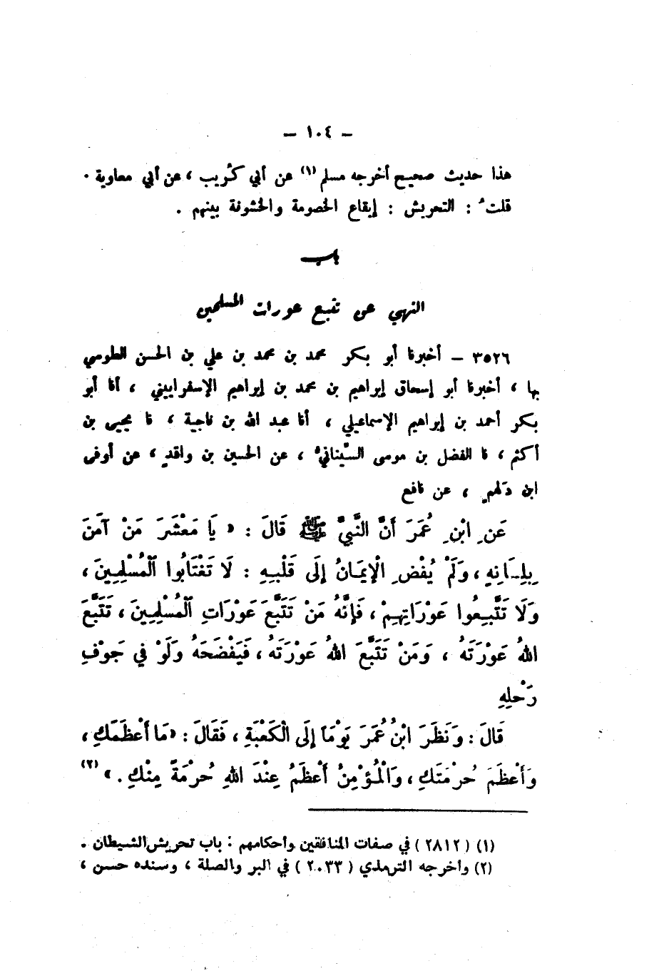 3526 - أَخْبَرَنَا أَبُو بَكْرٍ مُحَمَّدُ بْنُ مُحَمَّدِ بْنِ عَلِيِّ بْنِ الْحَسَنِ الطُّوسِيُّ، بِهَا، أَخْبَرَنَا أَبُو إِسْحَاقَ إِبْرَاهِيمُ بْنُ مُحَمَّدِ بْنِ إِبْرَاهِيمَ الإِسْفَرَايِينِيُّ، أَنا أَبُو بَكْرٍ أَحْمَدُ بْنُ إِبْرَاهِيمَ الإِسْمَاعِيلِيُّ، أَنا عَبْدُ اللَّهِ بْنُ نَاجِيَةَ، نَا يَحْيَى بْنُ أَكْثَمَ، نَا الْفَضْلُ بْنُ مُوسَى السِّينَانِيُّ، عَنِ الْحُسَيْنِ بْنِ وَاقِدٍ، عَنْ أَوْفَى بْنِ دَلْهَمٍ، عَنْ نَافِعٍ، عَنِ ابْنِ عُمَرَ، أَنّ النَّبِيَّ صَلَّى اللهُ عَلَيْهِ وَسَلَّمَ، قَالَ: " يَا مَعْشَرَ مَنْ آمَنَ بِلِسَانِهِ، وَلَمْ يُفْضِ الإِيمَانُ إِلَى قَلْبِهِ: لَا تَغْتَابُوا الْمُسْلِمِينَ، وَلا تَتَّبِعُوا عَوْرَاتِهِمْ، فَإِنَّهُ مَنْ تَتَبَّعَ عَوْرَاتِ الْمُسْلِمِينَ، تَتَبَّعَ اللَّهُ عَوْرَتَهُ، وَمَنْ تَتَبَّعَ اللَّهُ عَوْرَتَهُ، فَيَفْضَحَهُ وَلَوْ فِي جَوْفِ رَحْلِهِ "، قَالَ: وَنَظَرَ ابْنُ عُمَرَ يَوْمًا إِلَى الْكَعْبَةِ، فَقَالَ: مَا أَعْظَمَكِ، وَأَعْظَمَ حُرْمَتَكِ، وَالْمُؤْمِنُ أَعْظَمُ عِنْدَ اللَّهِ حُرْمَةً مِنْكِ.