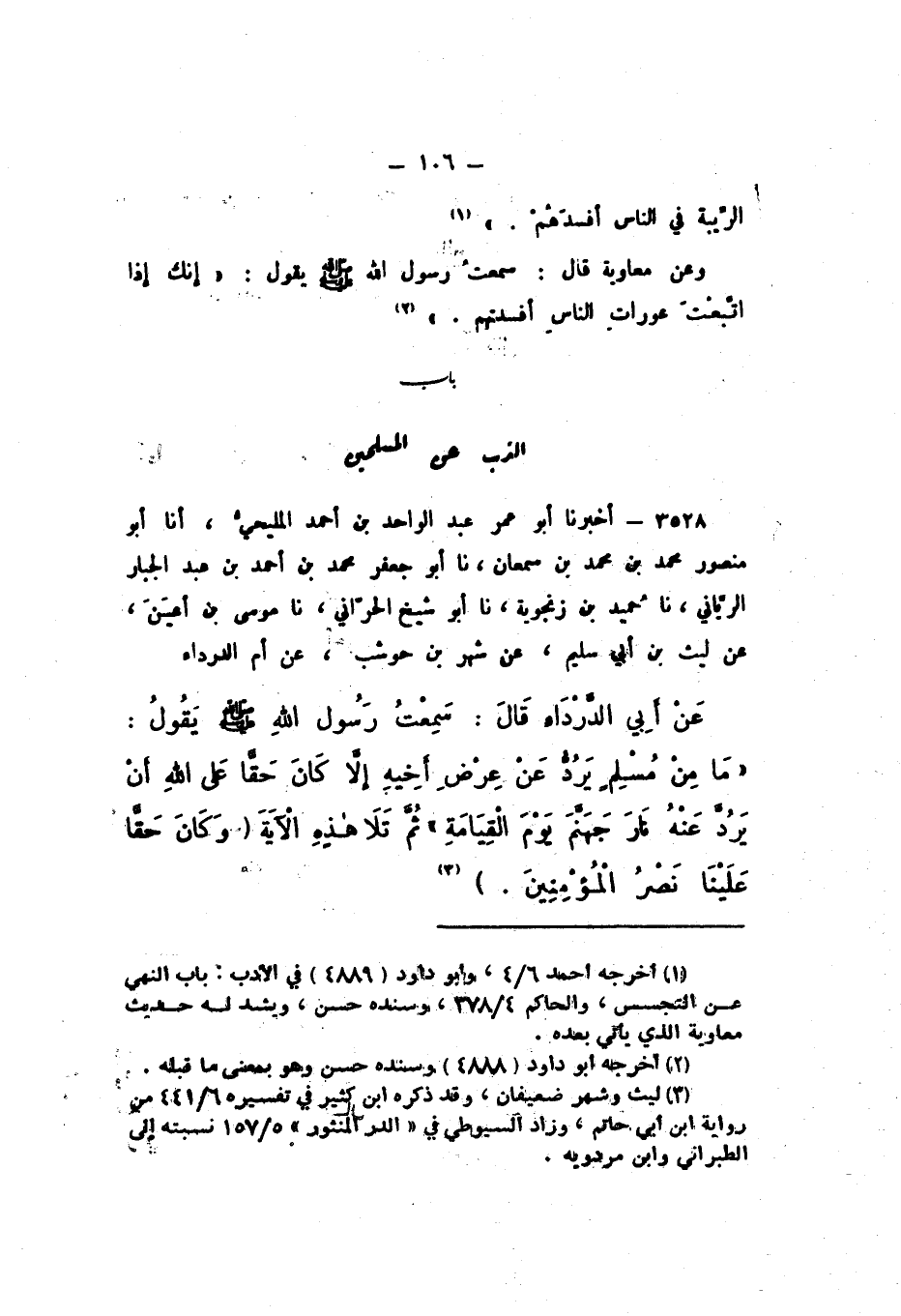 3528 - أَخْبَرَنَا أَبُو عُمَرَ عَبْدُ الْوَاحِدِ بْنُ أَحْمَدَ الْمَلِيحِيُّ، أَنا أَبُو مَنْصُورٍ مُحَمَّدُ بْنُ مُحَمَّدِ بْنِ سَمْعَانَ، نَا أَبُو جَعْفَرٍ مُحَمَّدُ بْنُ أَحْمَدَ بْنِ عَبْدِ الْجَبَّارِ الرَّيَّانِيُّ، نَا حُمَيْدُ بْنُ زَنْجُوَيْهِ، نَا أَبُو شَيْخٍ الْحَرَّانِيُّ، نَا مُوسَى بْنُ أَعْيَنَ، عَنْ لَيْثِ بْنِ أَبِي سُلَيْمٍ، عَنْ شَهْرِ بْنِ حَوْشَبٍ، عَنْ أُمِّ الدَّرْدَاءِ، عَنْ أَبِي الدَّرْدَاءِ، قَالَ: سَمِعْتُ رَسُولَ اللَّهِ صَلَّى اللهُ عَلَيْهِ وَسَلَّمَ، يَقُولُ: " مَا مِنْ مُسْلِمٍ يَرُدُّ عَنْ عِرْضِ أَخِيهِ إِلا كَانَ حَقًّا عَلَى اللَّهِ أَنْ يَرُدَّ عَنْهُ نَارَ جَهَنَّمَ يَوْمَ الْقِيَامَةِ، ثُمَّ تَلا هَذِهِ الآيَةَ: {وَكَانَ حَقًّا عَلَيْنَا نَصْرُ الْمُؤْمِنِينَ} [الرّوم: 47] "