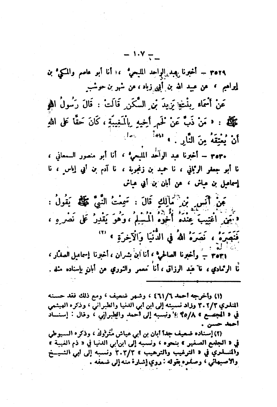 3530 - أَخْبَرَنَا عَبْدُ الْوَاحِدِ الْمَلِيحِيُّ، أَنا أَبُو مَنْصُورٍ السَّمْعَانِيُّ، نَا أَبُو جَعْفَرٍ الرَّيَّانِيُّ، نَا حُمَيْدُ بْنُ زَنْجُوَيْهِ، نَا آدَمُ بْنُ أَبِي إِيَاسٍ، نَا إِسْمَاعِيلُ بْنُ عَيَّاشٍ، عَنْ أَبَانِ بْنِ أَبِي عَيَّاشٍ، عَنْ أَنَسِ بْنِ مَالِكٍ، قَالَ: سَمِعْتُ النَّبِيَّ صَلَّى اللهُ عَلَيْهِ وَسَلَّمَ، يَقُولُ: «مَنِ اغْتِيبَ عِنْدَهُ أَخُوهُ الْمُسْلِمُ، وَهُوَ يقْدِرُ عَلَى نَصْرِهِ، فَنَصَرَهُ، نَصَرَهُ اللَّهُ فِي الدُّنْيَا وَالآخِرَةِ».