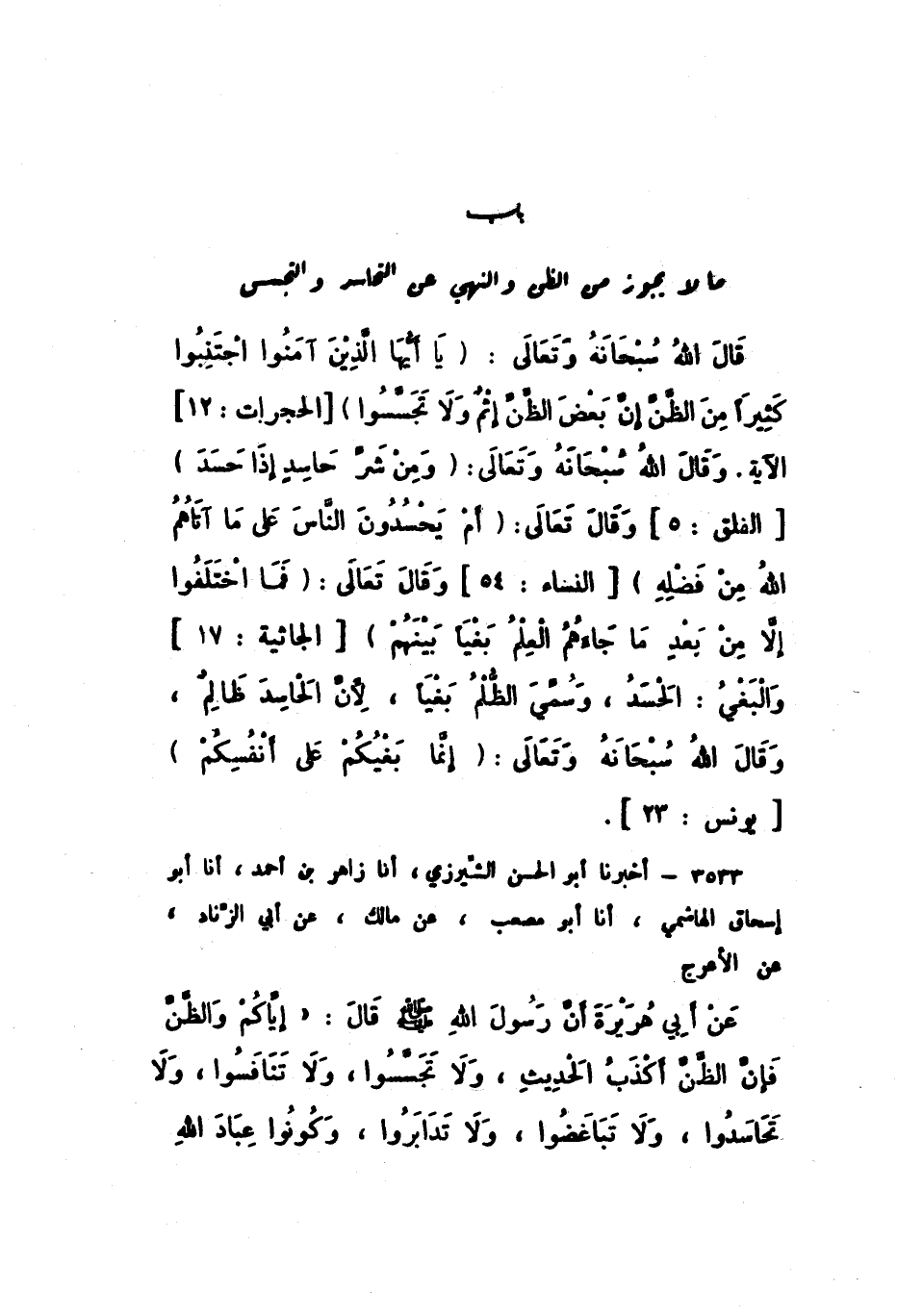 3533 - أَخْبَرَنَا أَبُو الْحَسَنِ الشِّيرَزِيُّ، أَنا زَاهِرُ بْنُ أَحْمَدَ، أَنا أَبُو إِسْحَاقَ الْهَاشِمِيُّ، أَنا أَبُو مُصْعَبٍ، عَنْ مَالِكٍ، عَنْ أَبِي الزِّنَادِ، عَنِ الأَعْرَجِ، عَنْ أَبِي هُرَيْرَةَ، أَنّ رَسُولَ اللَّهِ صَلَّى اللهُ عَلَيْهِ وَسَلَّمَ، قَالَ: «إِيَّاكُمْ وَالظَّنَّ فَإِنَّ الظَّنَّ أَكْذَبُ الْحَدِيثِ، وَلا تَجَسَّسُوا، وَلا تَنَافَسُوا، وَلا تَحَاسَدُوا، وَلا تَبَاغَضُوا، وَلا تَدَابَرُوا، وَكُونُوا عِبَادَ اللَّهِ