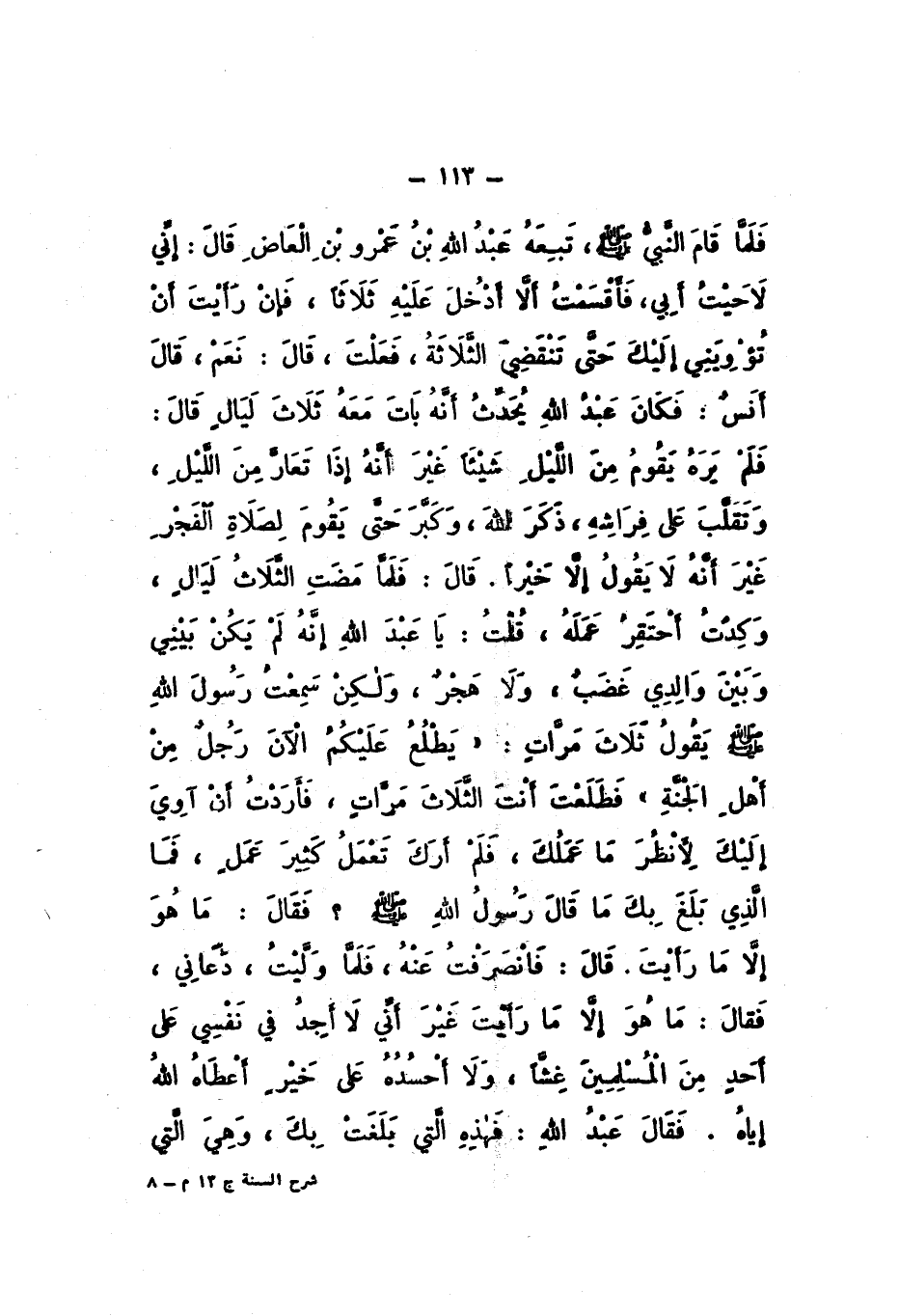 فَلَمَّا قَامَ النَّبِيُّ صَلَّى اللهُ عَلَيْهِ وَسَلَّمَ، تَبِعَهُ عَبْدُ اللَّهِ بْنُ عَمْرِو بْنِ الْعَاصِ، قَالَ: إِنِّي لاحَيْتُ أَبِي، فَأَقْسَمْتُ أَلا أَدْخُلَ عَلَيْهِ ثَلاثًا، فَإِنْ رَأَيْتَ أنْ تُئْوِيَنِي إِلَيْكَ حَتَّى تَنْقَضِيَ الثَّلاثَةُ، فَعَلْتَ، قَالَ: نَعَمْ "، قَالَ أَنَسٌ: فَكَانَ عَبْدُ اللَّهِ يُحَدِّثُ أَنَّهُ بَاتَ مَعَهُ ثَلاثَ لَيَالٍ، قَال: فَلَمْ يَرَهُ يَقُومُ مِنَ اللَّيْلِ شَيْئًا، غَيْرَ أَنَّهُ إذَا تَعَارَّ مِنَ اللَّيْلِ، وَتَقَلَّبَ عَلَى فِرَاشِهِ، ذَكَرَ اللَّهَ، وَكَبَّرَ حَتَّى يَقُومَ لِصَلاةِ الْفَجْرِ غَيْرَ أَنَّهُ لَا يَقُولُ إِلا خَيْرًا.