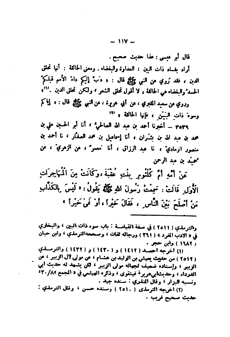3539 - أَخْبَرَنَا أَحْمَدُ بْنُ عَبْدِ اللَّهِ الصَّالِحِيُّ، أَنا أَبُو الْحُسَيْنِ عَلِيُّ بْنُ مُحَمَّدِ بْنِ عَبْدِ اللَّهِ بْنِ بِشْرَانَ، أَنا إِسْمَاعِيلُ بْنُ مُحَمَّدٍ الصَّفَّارُ، نَا أَحْمَدُ بْنُ مَنْصُورٍ الرَّمَادِيُّ، نَا عَبْدُ الرَّزَّاقِ، أَنا مَعْمَرٌ، عَنِ الزُّهْرِيِّ، عَنْ حُمَيْدِ بْنِ عَبْدِ الرَّحْمَنِ، عَنْ أُمِّهِ، أُمِّ كُلْثُومِ بِنْتِ عُقْبَةَ، وَكَانَتْ مِنَ الْمُهَاجِرَاتِ الأُوَلِ، قَالَتْ: سَمِعْتُ رَسُولَ اللَّهِ صَلَّى اللهُ عَلَيْهِ وَسَلَّمَ، يَقُولُ: «لَيْسَ بِالْكَذَّابِ مَنْ أَصْلَحَ بَيْنَ النَّاسِ، فَقَالَ خَيْرًا، أَوْ نَمَى خَيْرًا».
