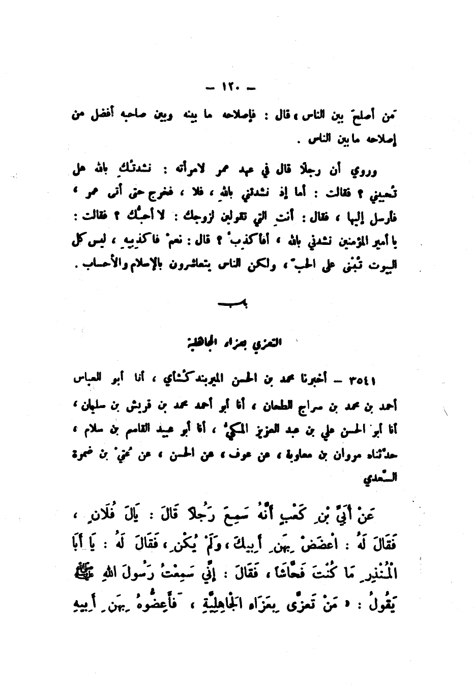 3541 - أَخْبَرَنَا مُحَمَّدُ بْنُ الْحَسَنِ الْمِيرَبَنْدَكُشَائِيُّ، أَنا أَبُو الْعَبَّاسِ أَحْمَدُ بْنُ مُحَمَّدِ بْنِ سِرَاجٍ الطَّحَّانُ، أَنا أَبُو أَحْمَدَ مُحَمَّدُ بْنُ قُرَيْشِ بْنِ سُلَيْمَانَ، أَنا أَبُو الْحَسَنِ عَلِيُّ بْنُ عَبْدِ الْعَزِيزِ الْمَكِّيُّ، أَنا أَبُو عُبَيْدٍ الْقَاسِمُ بْنُ سَلامٍ، حَدَّثَنَاهُ مَرْوَانُ بْنُ مُعَاوِيَةَ، عَنْ عَوْفٍ، عَنِ الْحَسَنِ، عَنْ عتي بْنِ ضَمْرَةَ السَّعْدِيِّ، عَنْ أُبَيِّ بْنِ كَعْبٍ، أَنَّهُ سَمِعَ رَجُلا، قَالَ: يَا لَفُلانٍ، وَيَا لَبَنِي فُلانٍ، فَقَالَ لَهُ: اعْضَضْ بِهَنِ أَبِيكَ، وَلَمْ يُكْنِ، فَقَالَ لَهُ: يَا أَبَا الْمُنْذِرِ، مَا كُنْتَ فَحَّاشًا، فَقَالَ: إِنِّي سَمِعْتُ رَسُولَ اللَّهِ صَلَّى اللهُ عَلَيْهِ وَسَلَّمَ، يَقُولُ: «مَنْ تَعزَّى بِعَزَاءِ الْجَاهِلِيَّةِ، فَأَعِضُّوهُ بِهَنِ أَبِيهِ