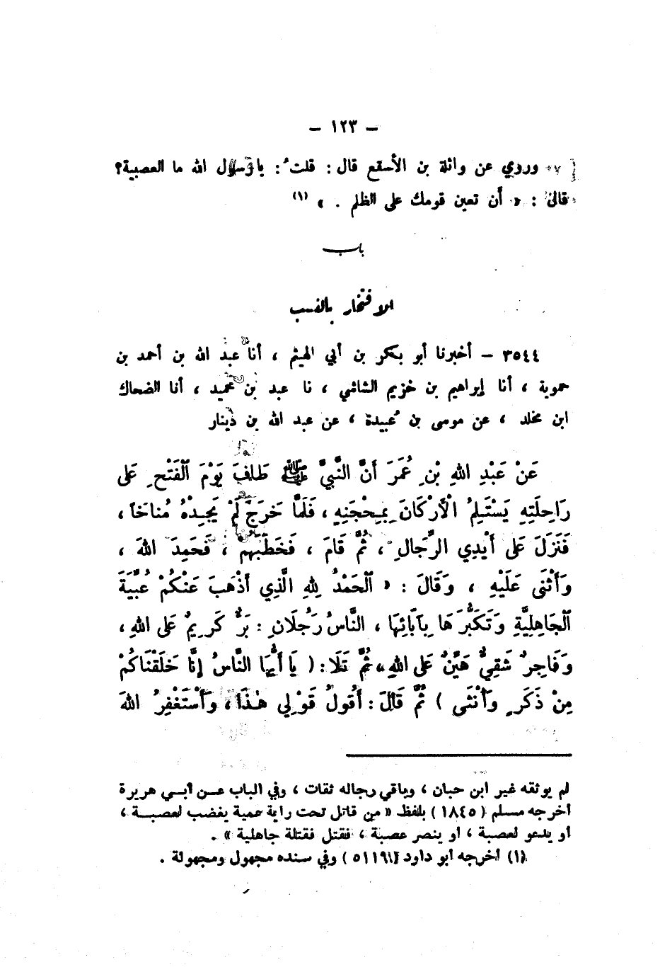3544 - أَخْبَرَنَا أَبُو بَكْرِ بْنُ أَبِي الْهَيْثَمِ، أَنا عَبْدُ اللَّهِ بْنُ أَحْمَدَ بْنِ حَمُّوَيْهِ، أَنا إِبْرَاهِيمُ بْنُ خُزَيْمٍ الشَّاشِيُّ، نَا عَبْدُ بْنُ حُمَيْدٍ، أَنا الضَّحَّاكُ بْنُ مَخْلَدٍ، عَنْ مُوسَى بْنِ عُبَيْدَةَ، عَنْ عَبْدِ اللَّهِ بْنِ دِينَارٍ، عَنْ عَبْدِ اللَّهِ بْنِ عُمَرَ، أَنّ النَّبِيَّ صَلَّى اللهُ عَلَيْهِ وَسَلَّمَ طَافَ يَوْمَ الْفَتْحِ عَلَى رَاحِلَتِهِ يَسْتَلِمُ الأَرْكَانَ بِمِحْجَنِهِ، فَلَمَّا خَرَجَ لَمْ يَجِدْهُ مُنَاخًا، فَنَزَلَ عَلَى أَيْدِي الرِّجَالِ، ثُمَّ قَامَ، فَخَطَبَهُمْ، فَحَمِدَ اللَّهَ، وَأَثْنَى عَلَيْهِ، وَقَالَ: " الْحَمْدُ لِلَّهِ الَّذِي أَذْهَبَ عَنْكُمْ عُبِّيَّةَ الْجَاهِلِيَّةِ وَتَكَبُّرَهَا بِآبَائِهَا، النَّاسُ رَجُلانِ: بَرٌّ كَرِيمٌ عَلَى اللَّهِ، وَفَاجِرٌ شَقِيٌّ هَيِّنٌ عَلَى اللَّهِ "، ثُمَّ تَلا: {يَأَيُّهَا النَّاسُ إِنَّا خَلَقْنَاكُمْ مِنْ ذَكَرٍ وَأُنْثَى} [الحجرات: 13]، ثُمَّ قَالَ: أَقُولُ قَوْلِي هَذَا، وَأَسْتَغْفِرُ اللَّهَ
