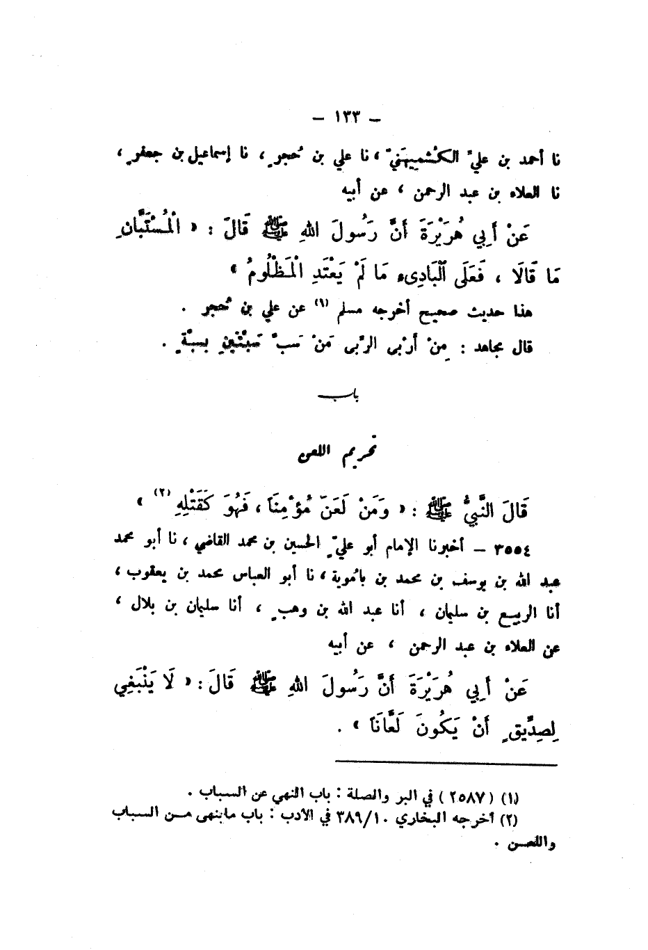 نَا أَحْمَدُ بْنُ عَلِيٍّ الْكُشْمِيهَنِيُّ، نَا عَلِيُّ بْنُ حُجْرٍ، نَا إِسْمَاعِيلُ بْنُ جَعْفَرٍ، نَا الْعَلاءُ بْنُ عَبْدِ الرَّحْمَنِ، عَنْ أَبِيهِ، عَنْ أَبِي هُرَيْرَةَ، أَنّ رَسُولَ اللَّهِ صَلَّى اللهُ عَلَيْهِ وَسَلَّمَ، قَالَ: «الْمُسْتَبَّانِ مَا قَالا فَعَلَى الْبَادِئِ مَا لَم يَعْتَدِ الْمَظْلُومُ».