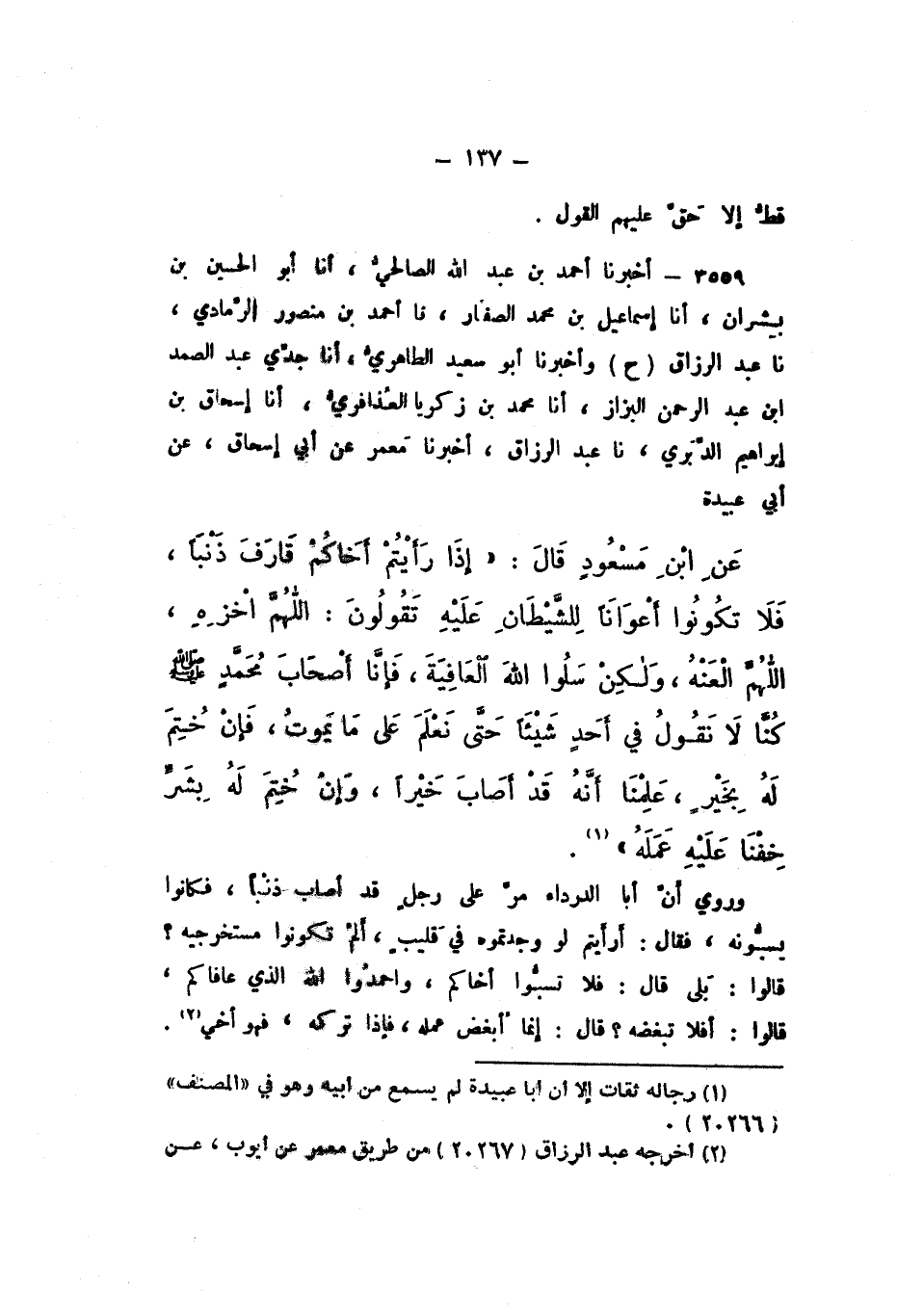 ح، وَأَخْبَرَنَا أَبُو سَعِيدٍ الطَّاهِرِيُّ، أَنا جَدِّي عَبْدُ الصَّمَدِ بْنُ عَبْدِ الرَّحْمَنِ الْبَزَّازُ، أَنا مُحَمَّدُ بْنُ زَكَرِيَّا الْعَذَافِرِيُّ، أَنا إِسْحَاقُ بْنُ إِبْرَاهِيمَ الدَّبَرِيُّ، نَا عَبْدُ الرَّزَّاقِ، أَخْبَرَنَا مَعْمَرٌ، عَنْ أَبِي إِسْحَاقَ، عَنْ أَبِي عُبَيْدَةَ، عَنِ ابْنِ مَسْعُودٍ، قَالَ: " إِذَا رَأَيْتُمْ أَخَاكُمْ قَارَفَ ذَنْبًا، فَلا تَكُونُوا أَعْوَانًا لِلشَّيْطَانِ عَلَيْهِ، تَقُولُونَ: اللَّهُمَّ اخْزِهِ، اللَّهُمَّ الْعَنْهُ، وَلَكِنْ سَلُوا اللَّهَ الْعَافِيَةَ، فَإِنَّا أَصْحَابَ مُحَمَّدٍ صَلَّى اللهُ عَلَيْهِ وَسَلَّمَ كُنَّا لَا نَقُولُ فِي أَحَدٍ شَيْئًا حَتَّى نَعْلَمَ عَلَى مَا يَموتُ، فَإِنْ خُتِمَ لَهُ بِخَيْرٍ، عَلِمْنَا أَنَّهُ قَدْ أَصَابَ خَيْرًا، وَإِنْ خُتِمَ لَهُ بِشَرٍّ، خِفْنَا عَلَيْهِ عَمَلَهُ "