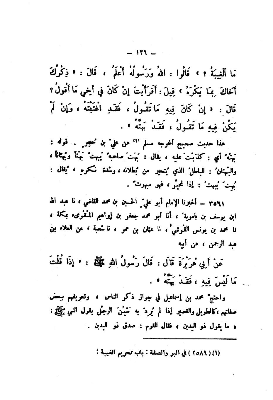 3561 - أَخْبَرَنَا الإِمَامُ أَبُو عَلِيٍّ الْحُسَيْنُ بْنُ مُحَمَّدٍ الْقَاضِي، نَا عَبْدُ اللَّهِ بْنُ يُوسُفَ بْنِ بَامَوَيْهِ، أَنا أَبُو مُحَمَّدٍ جَعْفَرُ بْنُ إِبْرَاهِيمَ الْمُقْرِئُ، بِمَكَّةَ، نَا مُحَمَّدُ بْنُ يُونُسَ الْقُرَشِيُّ، نَا عُثْمَانُ بْنُ عُمَرَ، نَا شُعْبَةُ، عَنِ الْعَلاءِ بْنِ عَبْدِ الرَّحْمَنِ، عَنْ أَبِيهِ، عَنْ أَبِي هُرَيْرَةَ، قَالَ: قَالَ رَسُولُ اللَّهِ صَلَّى اللهُ عَلَيْهِ وَسَلَّمَ: «إِذَا قُلْتَ مَا لَيْسَ فِيهِ، فَقَدْ بَهَتَّهُ»