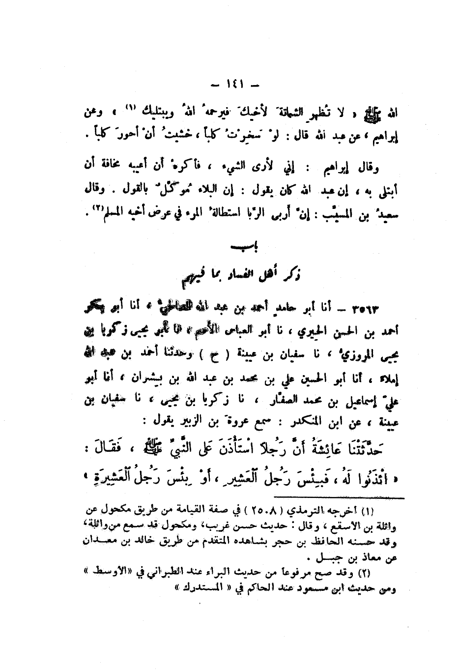 ح، وَحَدَّثَنَا أَحْمَدُ بْنُ عَبْدِ اللَّهِ، إِمْلاءً، أَنا أَبُو الْحُسَيْنِ عَلِيُّ بْنُ مُحَمَّدِ بْنِ عَبْدِ اللَّهِ بْنِ بِشْرَانَ، أَنا أَبُو عَلِيٍّ إِسْمَاعِيلُ بْنُ مُحَمَّدٍ الصَّفَّارُ، نَا زَكَرِيَّا بْنُ يَحْيَى، نَا سُفْيَانُ بْنُ عُيَيْنَةَ، عَنِ ابْنِ الْمُنْكَدِرِ، سَمِعَ عُرْوَةَ بْنَ الزُّبَيْرِ، يَقُولُ: حَدَّثَتْنَا عَائِشَةُ، " أَنَّ رَجُلا اسْتَأْذَنَ عَلَى النَّبِيِّ صَلَّى اللهُ عَلَيْهِ وَسَلَّمَ، فَقَالَ: ائْذَنُوا لَهُ، فَبِئْسَ رَجُلُ الْعَشِيرَ، أَوْ بِئْسَ رَجُلُ الْعَشِيرَةِ،