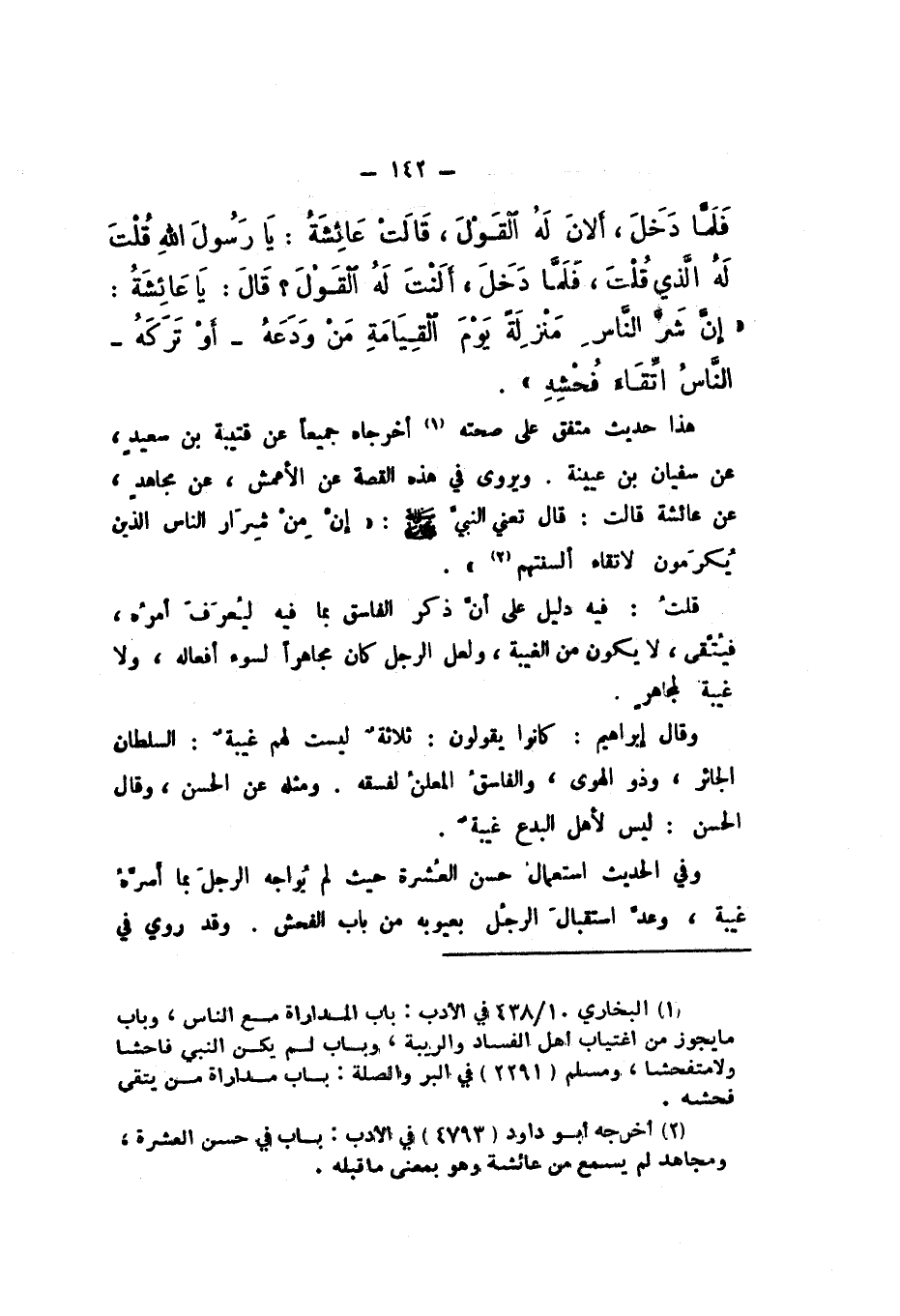 فَلَمَّا دَخَلَ، أَلانَ لَهُ الْقَوْلَ، قَالَتْ عَائِشَةُ: يَا رَسُولَ اللَّهِ، قُلْتَ لَهُ الَّذِي قُلْتَ، فَلَمَّا دَخَلَ، أَلَنْتَ لَهُ الْقَوْلَ؟ قَالَ: يَا عَائِشَةُ، إِنَّ شَرَّ النَّاسِ مَنْزِلَةً يَوْمَ الْقِيَامَةِ مَنْ وَدَعَهُ، أَوْ تَرَكَهُ، النَّاسُ اتِّقَاءَ فُحْشِهِ ".