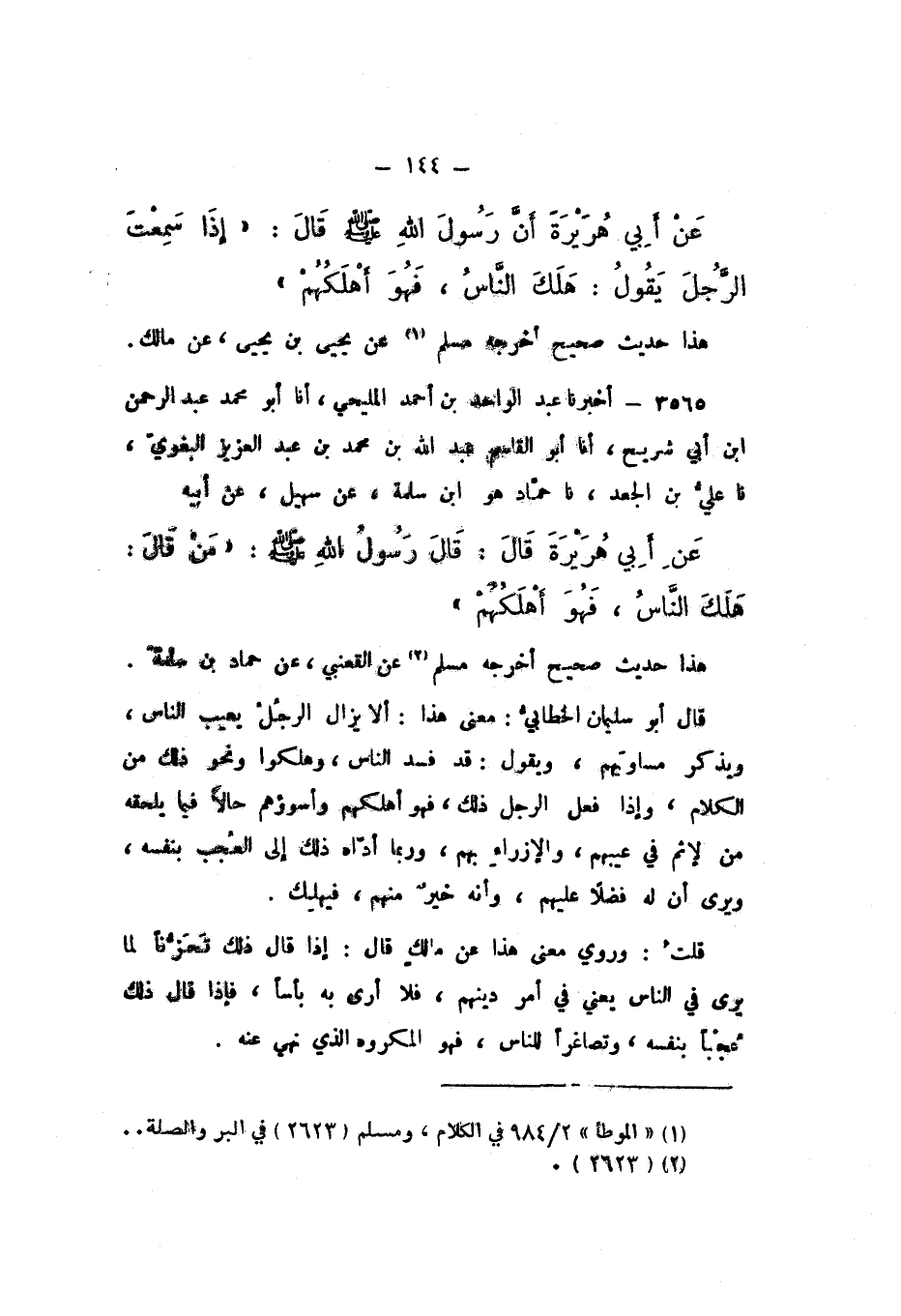 عَنْ أَبِي هُرَيْرَةَ، أَنّ رَسُولَ اللَّهِ صَلَّى اللهُ عَلَيْهِ وَسَلَّمَ، قَالَ: " إِذَا سَمِعْتَ الرَّجُلَ يَقُولُ: هَلَكَ النَّاسُ، فَهُوَ أَهْلَكُهُمْ ".