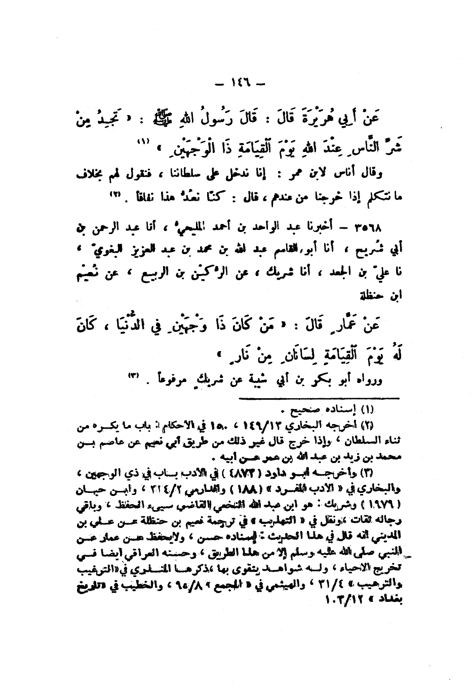 عَنْ أَبِي هُرَيْرَةَ، قَالَ: قَالَ رَسُولُ اللَّهِ صَلَّى اللهُ عَلَيْهِ وَسَلَّمَ: «تَجِدُ مِنْ شَرِّ النَّاسِ عِنْدَ اللَّهِ يَوْمَ الْقِيَامَةِ ذَا الْوَجْهَيْنِ»