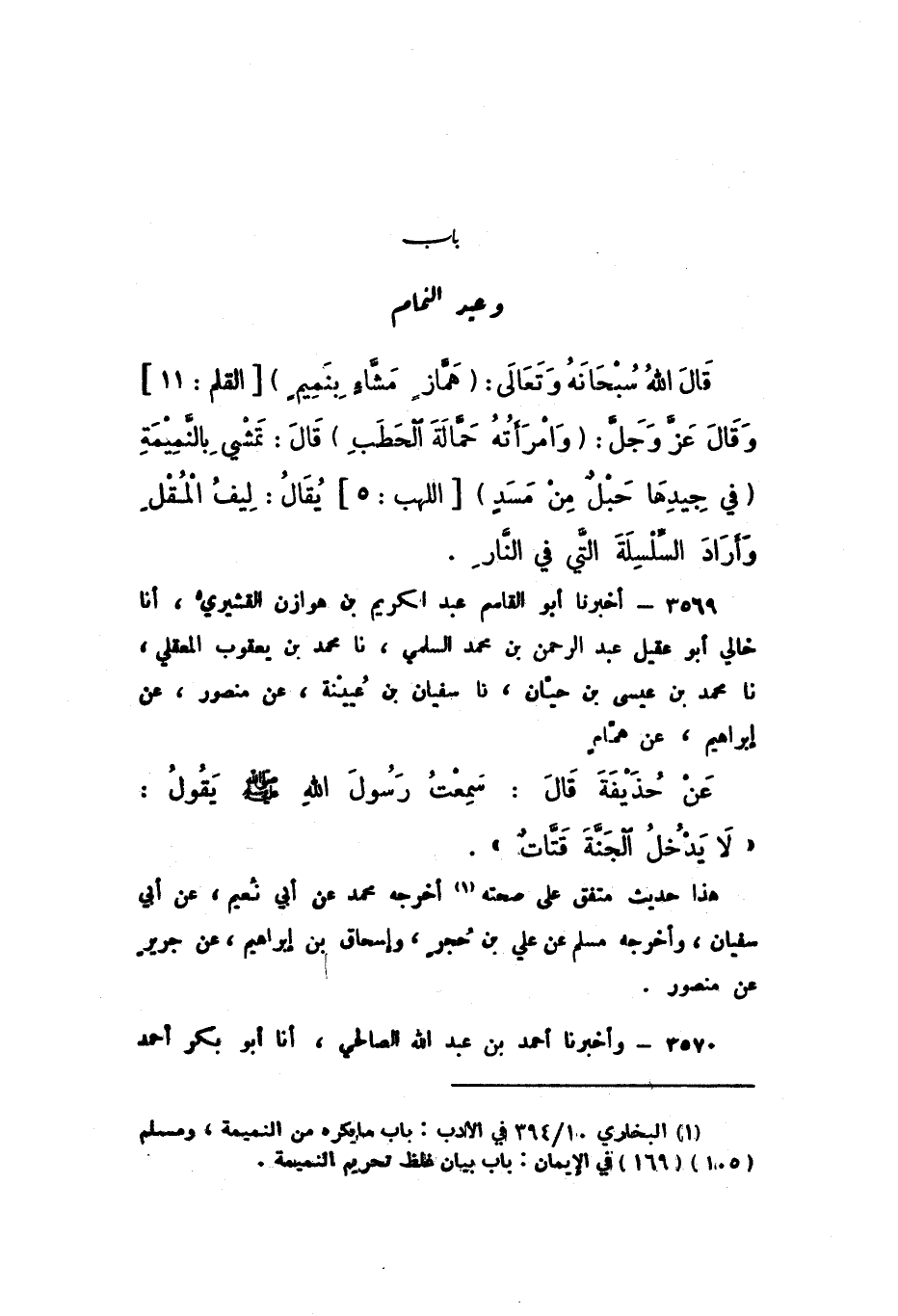 3569 - أَخْبَرَنَا أَبُو الْقَاسِمِ عَبْدُ الْكَرِيمِ بْنُ هَوَازِنَ الْقُشَيْرِيُّ، أَنا خَالِي أَبُو عَقِيلٍ عَبْدُ الرَّحْمَنِ بْنُ مُحَمَّدٍ السُّلَمِيُّ، نَا مُحَمَّدُ بْنُ يَعْقُوبَ الْمَعْقِلِيُّ، نَا مُحَمَّدُ بْنُ عِيسَى بْنِ حَيَّانَ، نَا سُفْيَانُ بْنُ عُيَيْنَةَ، عَنْ مَنْصُورٍ، عَنْ إِبْرَاهِيمَ، عَنْ هَمَّامٍ، عَنْ حُذَيْفَةَ، قَالَ: سَمِعْتُ رَسُولَ اللَّهِ صَلَّى اللهُ عَلَيْهِ وَسَلَّمَ، يَقُولُ: «لَا يَدْخُلُ الْجَنَّةَ قَتَّاتٌ».