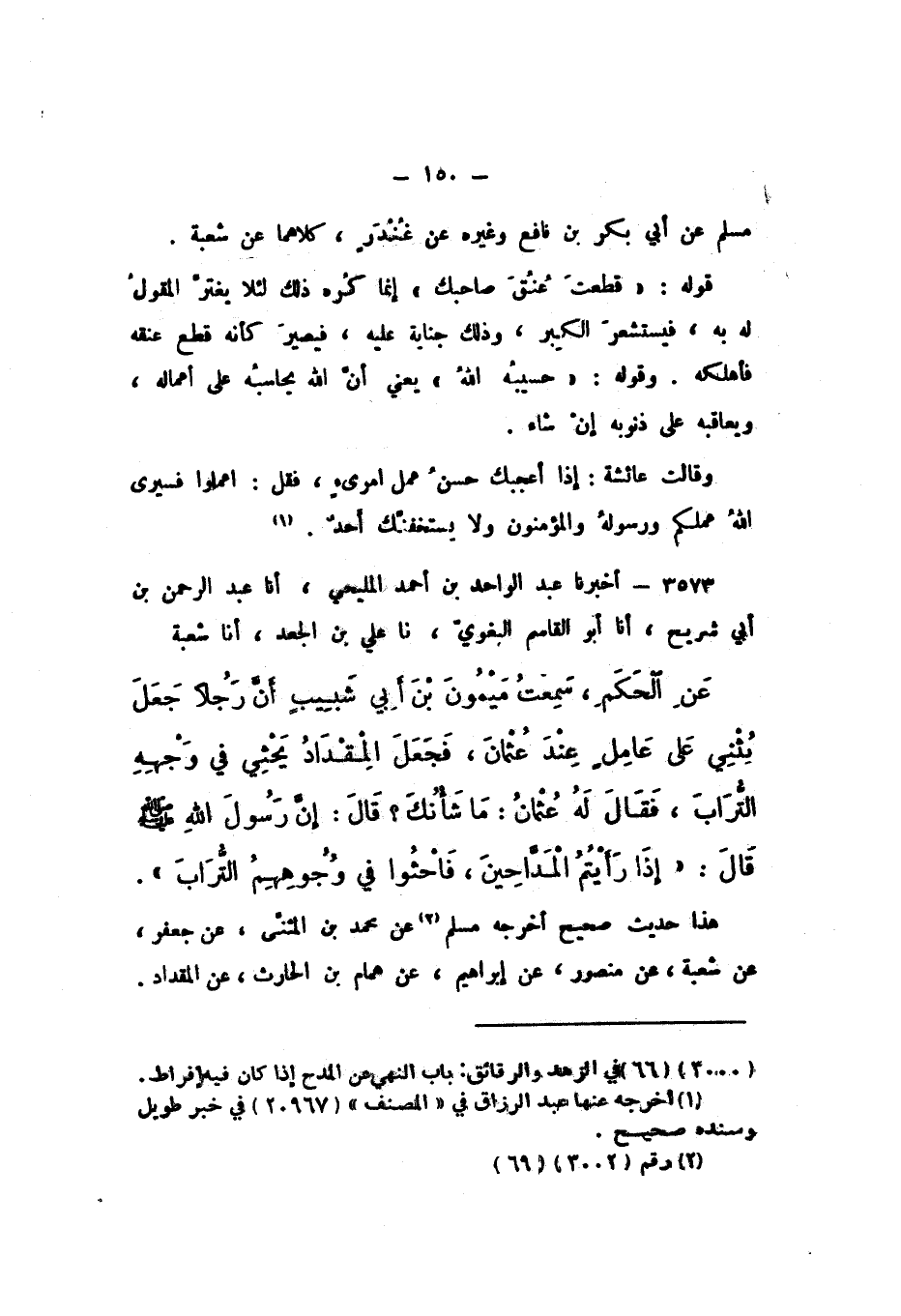 3573 - أَخْبَرَنَا عَبْدُ الْوَاحِدِ بْنُ أَحْمَدَ الْمَلِيحِيُّ، أَنا عَبْدُ الرَّحْمَنِ بْنُ أَبِي شُرَيْحٍ، أَنا أَبُو الْقَاسِمِ الْبَغَوِيُّ، نَا عَلِيُّ بْنُ الْجَعْدِ، أَنا شُعْبَةُ، عَنِ الْحَكَمِ، سَمِعْتُ مَيْمُونَ بْنَ أَبِي شَبِيبٍ، أَنَّ رَجُلا جَعَلَ يُثْنِي عَلَى عَامِلٍ عِنْدَ عُثْمَانَ، فَجَعَلَ الْمِقْدَادُ يَحْثِي فِي وَجْهِهِ التُّرَابَ، فَقَالَ لَهُ عُثْمَانُ: مَا شَأْنُكَ؟ قَالَ: إِنَّ رَسُولَ اللَّهِ صَلَّى اللهُ عَلَيْهِ وَسَلَّمَ، قَالَ: «إِذَا رَأَيْتُمُ الْمَدَّاحِينَ، فَاحْثُوا فِي وُجُوهِهِمُ التُّرَابَ».