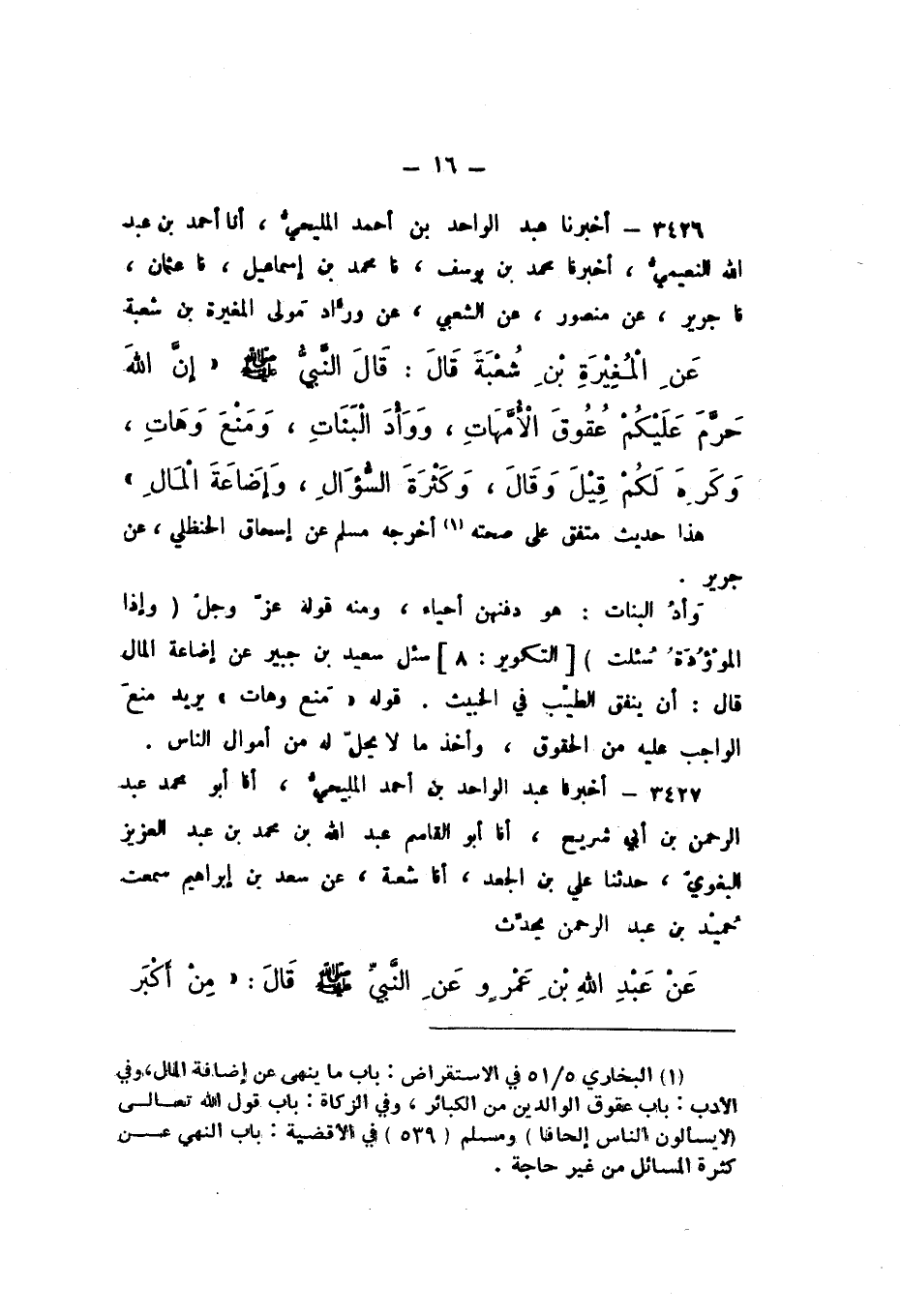 3426 - أَخْبَرَنَا عَبْدُ الْوَاحِدِ بْنُ أَحْمَدَ الْمَلِيحِيُّ، أَنا أَحْمَدُ بْنُ عَبْدِ اللَّهِ النُّعَيْمِيُّ، أَخْبَرَنَا مُحَمَّدُ بْنُ يُوسُفَ، نَا مُحَمَّدُ بْنُ إِسْمَاعِيلَ، نَا عُثْمَانُ، نَا جَرِيرٌ، عَنْ مَنْصُورٍ، عَنِ الشَّعْبِيِّ، عَنْ وَرَّادٍ مَوْلَى الْمُغِيرَةِ بْنِ شُعْبَةَ، عَنِ الْمُغِيرَةِ بْنِ شُعْبَةَ، قَالَ: قَالَ النَّبِيُّ صَلَّى اللهُ عَلَيْهِ وَسَلَّمَ: «إِنَّ اللَّهَ حَرَّمَ عَلَيْكُمْ عُقُوقَ الأُمَّهَاتِ، وَوَأْدَ الْبَنَاتِ، وَمَنْعَ وَهَاتِ، وَكَرِهَ لَكُمْ قِيلَ وَقَالَ، وَكَثْرَةَ السُّؤَالِ، وَإِضَاعَةَ الْمَالِ».