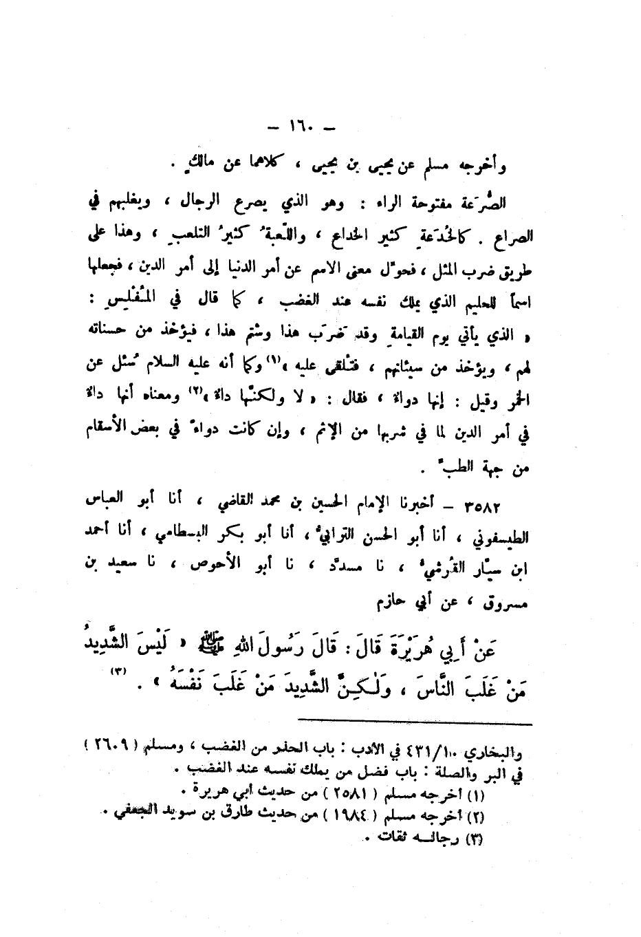 3582 - أَخْبَرَنَا الإِمَامُ الْحُسَيْنُ بْنُ مُحَمَّدٍ الْقَاضِي، أَنا أَبُو الْعَبَّاسِ الطَّيْسَفُونِيُّ، أَنا أَبُو الْحَسَنِ التُّرَابِيُّ، أَنا أَبُو بَكْرٍ الْبِسْطَامِيُّ، أَنا أَحْمَدُ بْنُ سَيَّارٍ الْقُرَشِيُّ، نَا مُسَدَّدٌ، نَا أَبُو الأَحْوَصِ، نَا سَعِيدُ بْنُ مَسْرُوقٍ، عَنْ أَبِي حَازِمٍ، عَنْ أَبِي هُرَيْرَةَ، قَالَ: قَالَ رَسُولُ اللَّهِ صَلَّى اللهُ عَلَيْهِ وَسَلَّمَ: «لَيْسَ الشَّدِيدُ مَنْ غَلَبَ النَّاسَ، وَلَكِنَّ الشَّدِيدَ مَنْ غَلَبَ نَفْسَهُ»