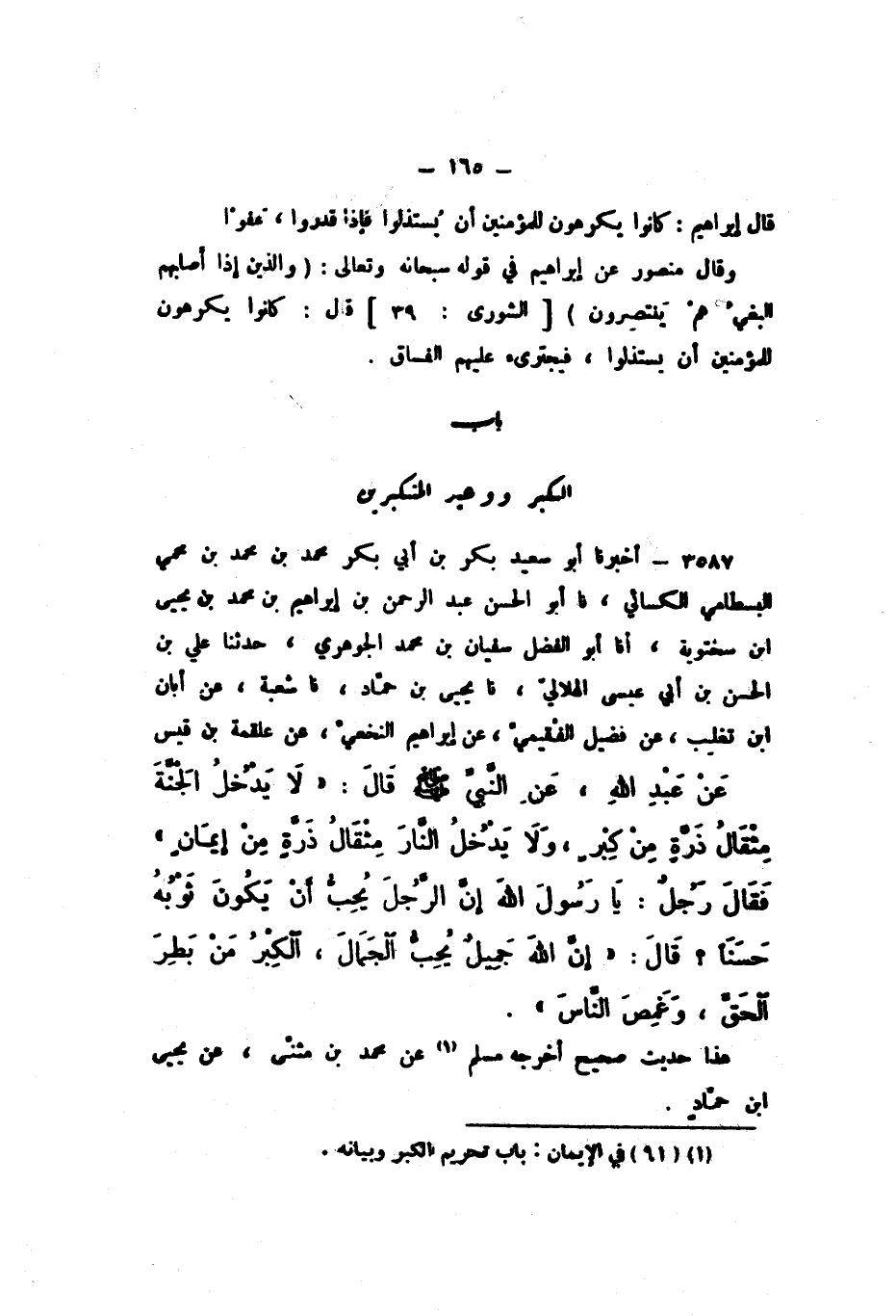 3587 - أَخْبَرَنَا أَبُو سَعِيدٍ بَكْرُ بْنُ أَبِي بَكْرٍ مُحَمَّدِ بْنِ مُحَمَّدِ بْنِ مَحْمِيٍّ الْبِسْطَامِيُّ الْكِسَائِيُّ، نَا أَبُو الْحَسَنِ عَبْدُ الرَّحْمَنِ بْنُ إِبْرَاهِيمَ بْنِ مُحَمَّدِ بْنِ يَحْيَى بْنِ سَخْتَوَيْهِ، أَنا أَبُو الْفَضْلِ سُفْيَانُ بْنُ مُحَمَّدٍ الْجَوْهَرِيُّ، حَدَّثَنَا عَلِيُّ بْنُ الْحَسَنِ بْنِ أَبِي عِيسَى الْهِلالِيُّ، نَا يَحْيَى بْنُ حَمَّادٍ، نَا شُعْبَةُ، عَنْ أَبَانِ بْنِ تَغْلِبَ، عَنْ فُضَيْلٍ الْفُقَيْمِيِّ، عَنْ إِبْرَاهِيمَ النَّخَعِيِّ، عَنْ عَلْقَمَةَ بْنِ قَيْسٍ، عَنْ عَبْدِ اللَّهِ، عَنِ النَّبِيِّ صَلَّى اللهُ عَلَيْهِ وَسَلَّمَ، قَالَ: " لَا يَدْخُلُ الْجَنَّةَ مِثْقَالُ ذَرَّةٍ مِنْ كِبْرٍ، وَلا يَدْخُلُ النَّارَ مِثْقَالُ ذَرَّةٍ مِنْ إِيمَانٍ.