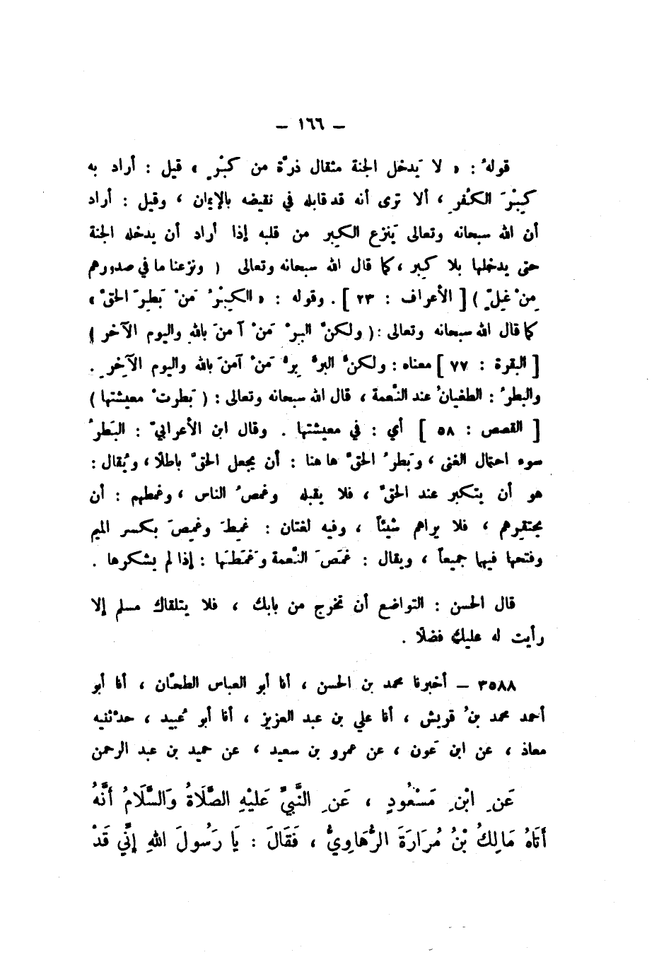 وَقَوله: «الْكبر من بطر الْحق»، كَمَا قَالَ الله سُبْحَانَهُ وَتَعَالَى: {وَلَكِنَّ الْبِرَّ مَنْ آمَنَ بِاللَّهِ وَالْيَوْمِ الآخِرِ} [الْبَقَرَة: 177]، مَعْنَاهُ: وَلَكِن الْبر بر من آمن بِاللَّه وَالْيَوْم الآخر.