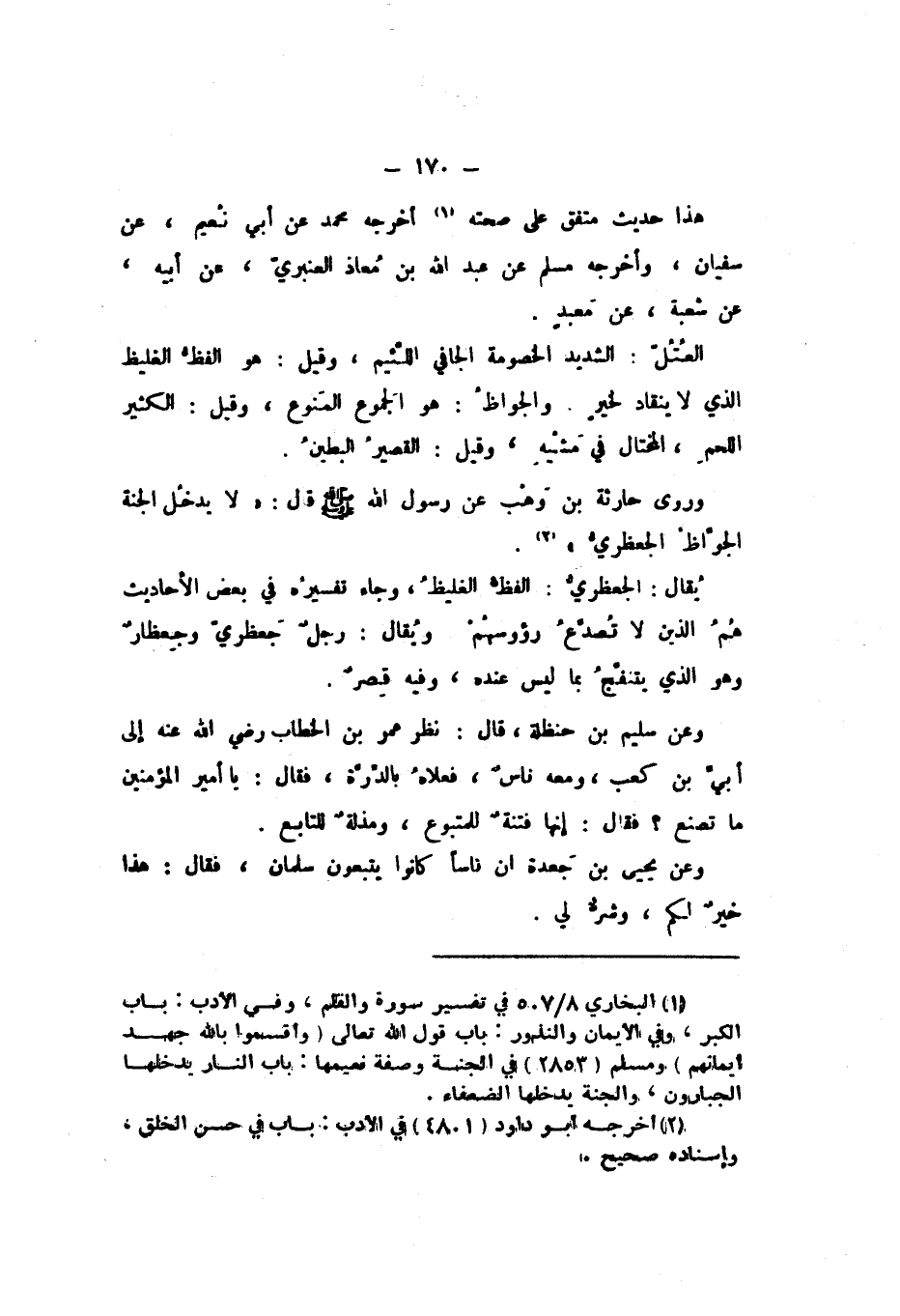 وروى حَارِثَة بْن وهب، عَن رَسُول الله صَلَّى اللهُ عَلَيْهِ وَسَلَّمَ، قَالَ: «لَا يدْخل الْجنَّة الجواظ الجعظري».