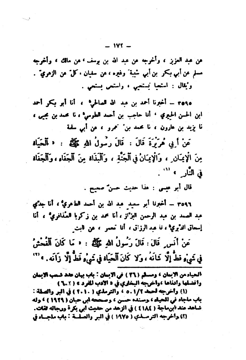 3595 - أَخْبَرَنَا أَحْمَدُ بْنُ عَبْدِ اللَّهِ الصَّالِحِيُّ، أَنا أَبُو بَكْرٍ أَحْمَدُ بْنُ الْحَسَنِ الْحِيرِيُّ، أَنا حَاجِبُ بْنُ أَحْمَدَ الطُّوسِيُّ، نَا مُحَمَّدُ بْنُ يَحْيَى، نَا يَزِيدُ بْنُ هَارُونَ، نَا مُحَمَّدُ بْنُ عَمْرٍو، عَنْ أَبِي سَلَمَةَ، عَنْ أَبِي هُرَيْرَةَ، قَالَ: قَالَ رَسُولُ اللَّهِ صَلَّى اللهُ عَلَيْهِ وَسَلَّمَ: «الْحَيَاءُ مِنَ الإِيمَانِ، وَالإِيمَانُ فِي الْجَنَّةِ، وَالْبَذَاءُ مِنَ الْجَفَاءِ، وَالْجَفَاءُ فِي النَّارِ».