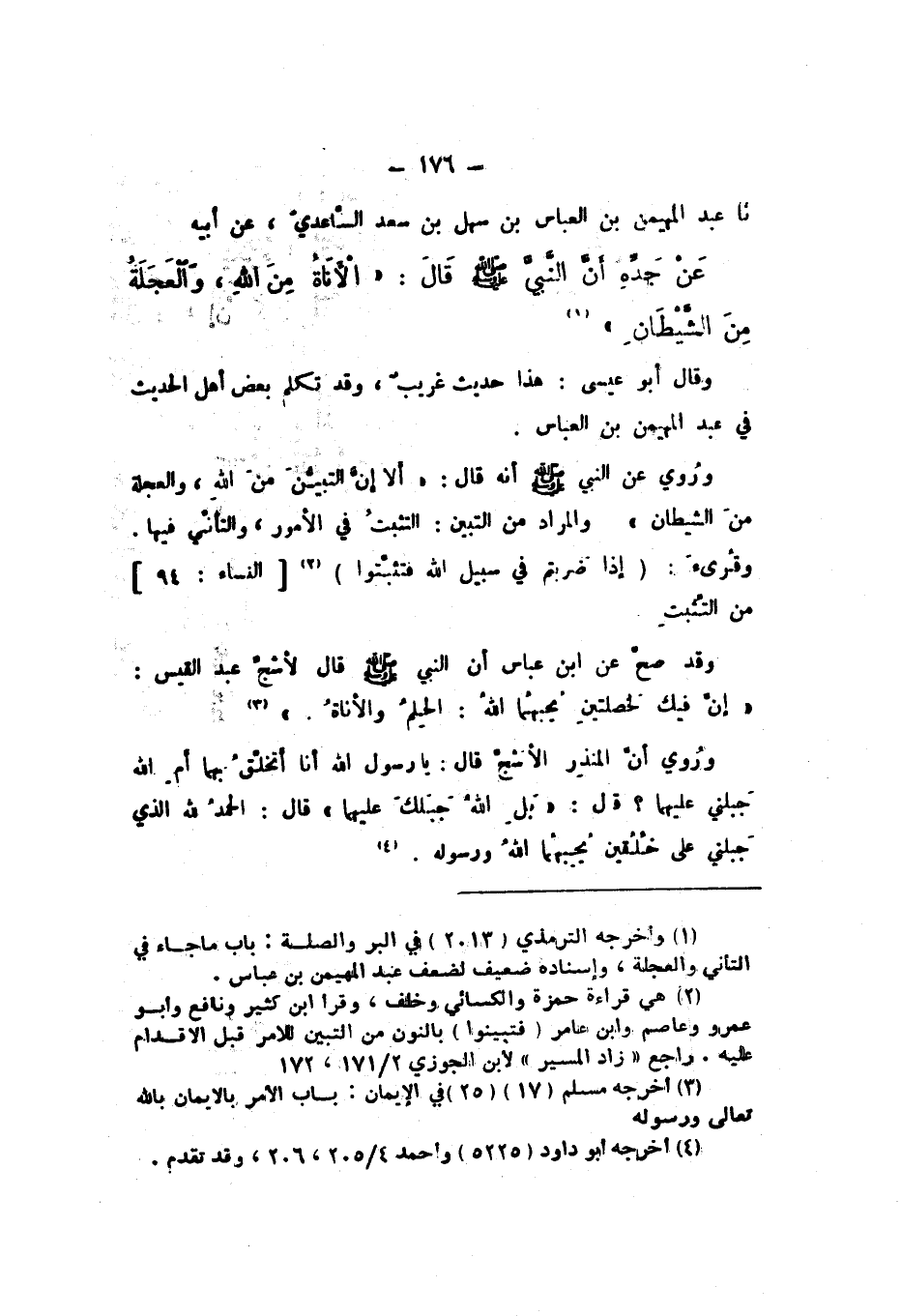 وَقد صَحَّ عَن ابْن عَبَّاس، أَن النَّبِيّ صَلَّى اللهُ عَلَيْهِ وَسَلَّمَ، قَالَ لأشج عَبْد الْقَيْس: " إِن فِيك لخصلتين يحبهما الله: الْحلم والأناة ".