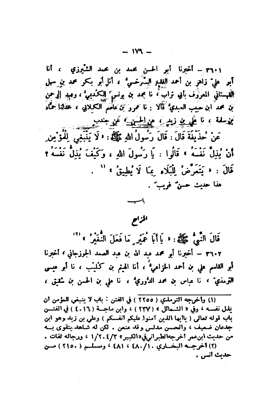 3601 - أَخْبَرَنَا أَبُو الْحَسَنِ مُحَمَّدُ بْنُ مُحَمَّدٍ الشِّيرَزِيُّ، أَنا أَبُو عَلِيٍّ زَاهِرُ بْنُ أَحْمَدَ الْفَقِيهُ السَّرَخْسِيُّ، أَنا أَبُو بَكْرٍ مُحَمَّدُ بْنُ سَهْلٍ الْقُهُسْتَانِيُّ الْمَعْرُوفُ بِأَبِي تُرَابٍ، نَا مُحَمَّدُ بْنُ يُونُسَ الْكُدَيْمِيُّ، وَعَبْدُ الرَّحْمَنِ بْنُ مُحَمَّدِ بْنِ حَبِيبٍ الْعَبْدِيُّ، قَالا: نَا عَمْرُو بْنُ عَاصِمٍ الْكِلابِيُّ، حَدَّثَنَا حَمَّادُ بْنُ سَلَمَةَ، نَا عَلِيُّ بْنُ زَيْدٍ، عَنِ الْحَسَنِ، عَنْ جُنْدَبٍ، عَنْ حُذَيْقَةَ، قَالَ: قَالَ رَسُولُ اللَّهِ صَلَّى اللهُ عَلَيْهِ وَسَلَّمَ: «لَا يَنْبَغِي لِلْمُؤْمِنِ أَنْ يُذِلَّ نَفْسَهُ».