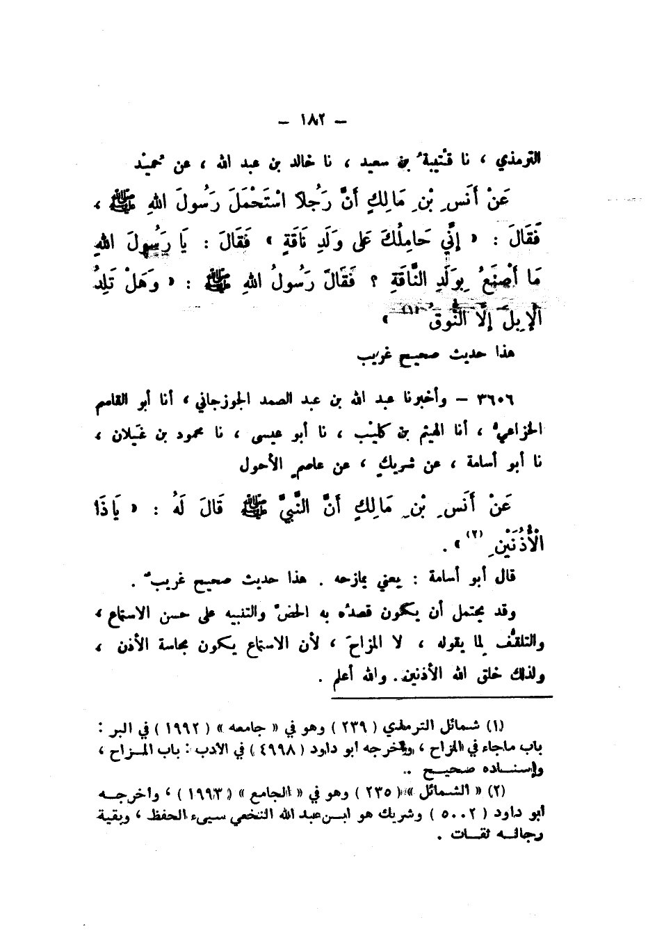 التِّرْمِذِيُّ، نَا قُتَيْبَةُ بْنُ سَعِيدٍ، نَا خَالِدُ بْنُ عَبْدِ اللَّهِ، عَنْ حُمَيْدٍ، عَنْ أَنَسِ بْنِ مَالِكٍ، " أَنَّ رَجُلا اسْتَحْمَلَ رَسُولَ اللَّهِ صَلَّى اللهُ عَلَيْهِ وَسَلَّمَ، فَقَالَ: إِنِّي حَامِلُكَ عَلَى وَلَدِ نَاقَةٍ، فَقَالَ: يَا رَسُولَ اللَّهِ مَا أَصْنَعُ بِوَلَدِ النَّاقَةِ؟ فَقَالَ رَسُولُ اللَّهِ صَلَّى اللهُ عَلَيْهِ وَسَلَّمَ: وَهَلْ تَلِدُ الإِبِلَ إِلا النُّوقُ ".