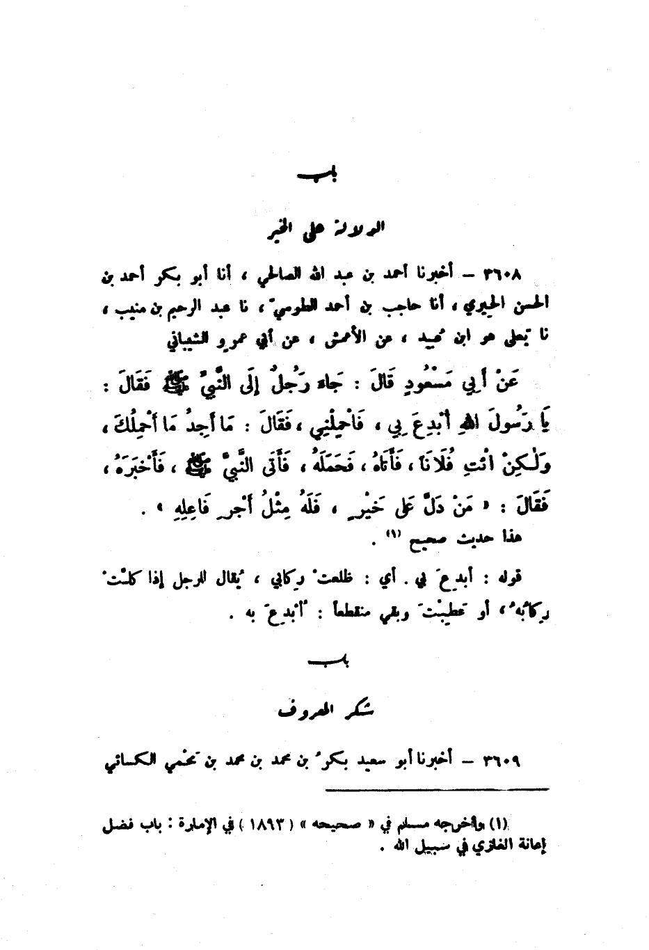 3608 - أَخْبَرَنَا أَحْمَدُ بْنُ عَبْدِ اللَّهِ الصَّالِحِيُّ، أَنا أَبُو بَكْرٍ أَحْمَدُ بْنُ الْحَسَنِ الْحِيرِيُّ، أَنا حَاجِبُ بْنُ أَحْمَدَ الطُّوسِيُّ، نَا عَبْدُ الرَّحِيمِ بْنُ مُنِيبٍ، نَا يَعْلَى، هُوَ ابْنُ عُبَيْدٍ، عَنِ الأَعْمَشِ، عَنْ أَبِي عَمْرٍو الشَّيْبَانِيِّ، عَنْ أَبِي مَسْعُودٍ، قَالَ: " جَاءَ رَجُلٌ إِلَى النَّبِيِّ صَلَّى اللهُ عَلَيْهِ وَسَلَّمَ، فَقَالَ: يَا رَسُولَ اللَّهِ، أُبْدِعَ بِي، فَاحْمِلْنِي، فَقَالَ: مَا أَجِدُ مَا أَحْمِلُكَ، وَلَكِنِ ائْتِ فُلانًا، فَأَتَاهُ، فَحَمَلَهُ، فَأَتَى النَّبِيَّ صَلَّى اللهُ عَلَيْهِ وَسَلَّمَ، فَأَخْبَرَهُ، فَقَالَ: مَنْ دَلَّ عَلَى خَيْرٍ، فَلَهُ مِثْلُ أَجْرِ فَاعِلِهِ ".