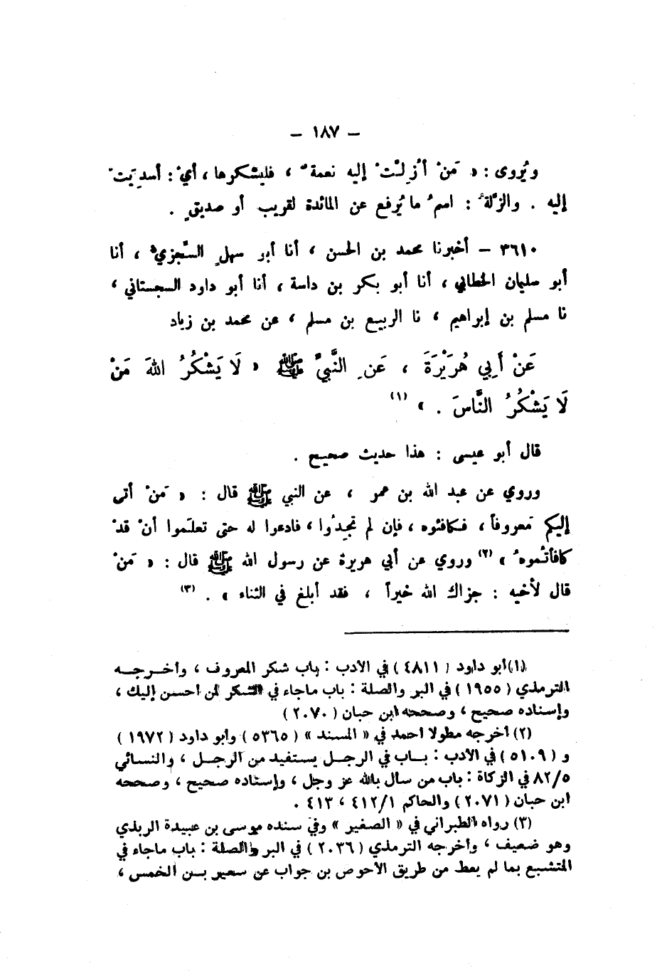 3610 - أَخْبَرَنَا مُحَمَّدُ بْنُ الْحَسَنِ، أَنا أَبُو سَهْلٍ السِّجْزِيُّ، أَنا أَبُو سُلَيْمَانَ الْخَطَّابِيُّ، أَنا أَبُو بَكْرِ بْنُ دَاسَةَ، أَنا أَبُو دَاوُدَ السِّجِسْتَانِيُّ، نَا مُسْلِمُ بْنُ إِبْرَاهِيمَ، نَا الرَّبِيعُ بْنُ مُسْلِمٍ، عَنْ مُحَمَّدِ بْنِ زِيَادٍ، عَنْ أَبِي هُرَيْرَةَ، عَنِ النَّبِيِّ صَلَّى اللهُ عَلَيْهِ وَسَلَّمَ، «لَا يَشْكُرُ اللَّهَ مَنْ لَا يَشْكُرُ النَّاسَ».