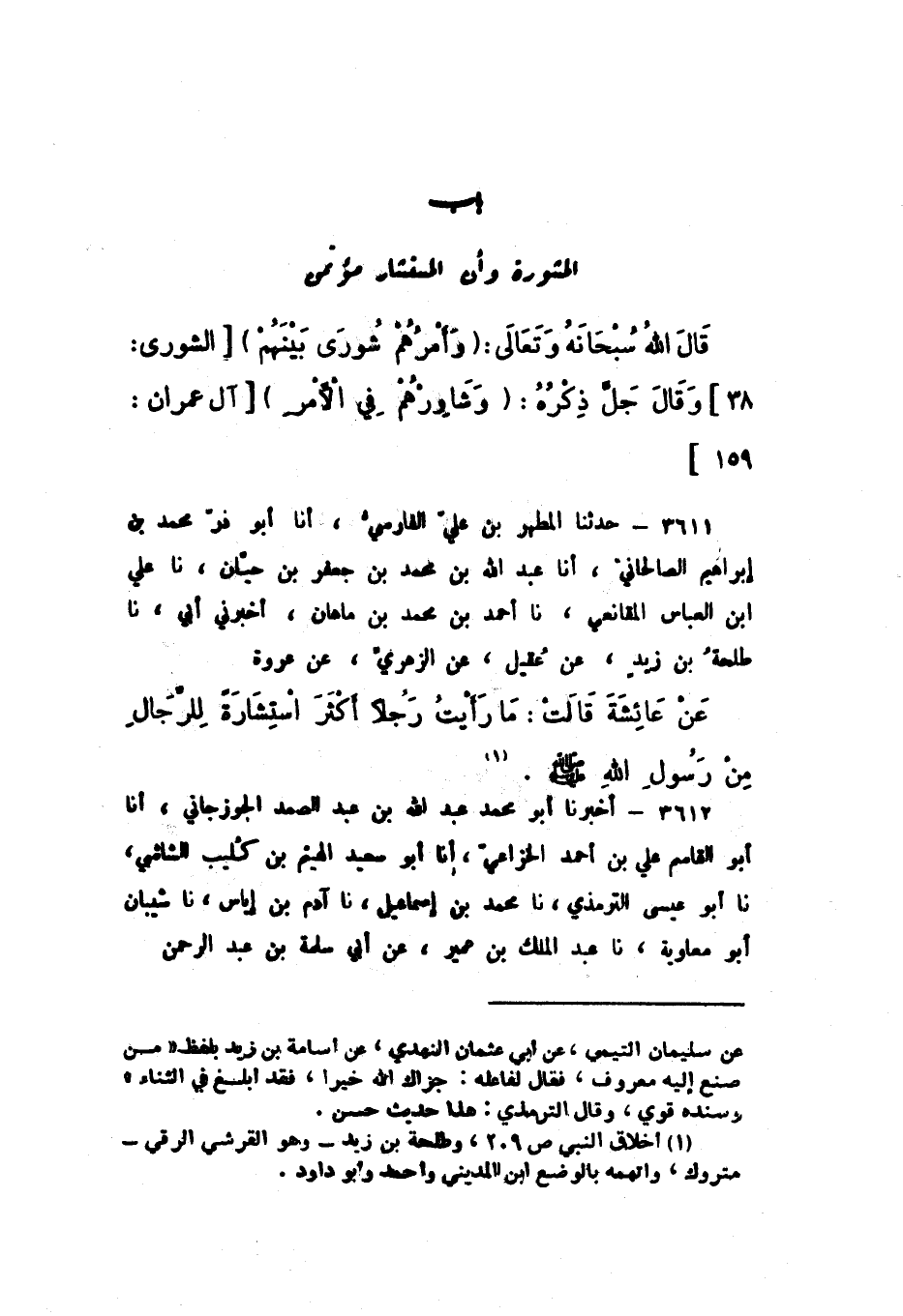 قَالَ اللَّهُ سُبْحَانَهُ وَتَعَالَى: {وَأَمْرُهُمْ شُورَى بَيْنَهُمْ} [الشورى: 38]، وَقَالَ جلّ ذكره: {وَشَاوِرْهُمْ فِي الأَمْرِ} [آل عمرَان: 159].