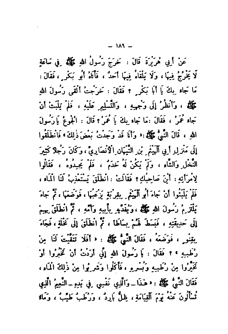 عَنْ أَبِي هُرَيْرَةَ، قَالَ: " خَرَجَ رَسُولُ اللَّهِ صَلَّى اللهُ عَلَيْهِ وَسَلَّمَ فِي سَاعَةٍ لَا يَخْرُجُ فِيهَا، وَلا يَلْقَاهُ فِيهَا أَحَدٌ، فَأَتَاهُ أَبُو بَكْرٍ، فَقَالَ: مَا جَاءَ بِكَ يَا أَبَا بَكْرٍ؟ فَقَالَ: خَرَجْتُ أَلْقَى رَسُولَ اللَّهِ صَلَّى اللهُ عَلَيْهِ وَسَلَّمَ، وَأَنْظُرُ إِلَى وَجْهِهِ، وَالتَّسْلِيمَ عَلَيْهِ، فَلَمْ يَلْبَثْ أَنْ جَاءَ عُمَرُ، فَقَالَ: مَا جَاءَ بِكَ يَا عُمَرُ؟ قَالَ: الْجُوعُ يَا رَسُولَ اللَّهِ، قَالَ النَّبِيُّ صَلَّى اللهُ عَلَيْهِ وَسَلَّمَ: وَأَنَا قَدْ وَجَدْتُ بَعْضَ ذَلِكَ، فَانْطَلَقُوا إِلَى مَنْزِلِ أَبِي الْهَيْثَمِ بْنِ التَّيْهَانِ الأَنْصَارِيِّ، وَكَانَ رَجُلا كَثِيرَ النَّخْلِ وَالشَّاءِ، وَلَمْ يَكُنْ لَهُ خَدَمٌ، فَلَمْ يَجِدُوهُ، فَقَالُوا لامْرَأَتِهِ: أَيْنَ صَاحِبُكِ؟ فَقَالَتِ: انْطَلَقَ يَسْتَعْذِبُ لَنَا الْمَاءَ، فَلَمْ يَلْبَثُوا أَنْ جَاءَ أَبُو الْهَيْثَمِ بِقِرْبَةٍ يَزْعَبُهَا، فَوَضَعَهَا، ثُمَّ جَاءَ يَلْتَزِمُ رَسُولَ اللَّهِ صَلَّى اللهُ عَلَيْهِ وَسَلَّمَ، وَيُفَدِّيهِ بِأَبِيهِ وَأُمِّهِ، ثُمَّ انْطَلَقَ بِهِمْ إِلَى حَدِيقَتِهِ، فَبَسَطَ لَهُمْ بِسَاطًا، ثُمَّ انْطَلَقَ إِلَى نَخْلَةٍ، فَجَاءَ بِقِنْوٍ، فَوَضَعَهُ، فَقَالَ النَّبِيُّ صَلَّى اللهُ عَلَيْهِ وَسَلَّمَ: أَفَلا تَنَقَّيْتَ لَنَا مِنْ رُطَبِهِ؟ فَقَالَ: يَا رَسُولَ اللَّهِ، إِنِّي أَرَدْتُ أَنْ تَخْبُرُوا أَوْ تَخَيَّرُوا مِنْ رُطَبِهِ وَبُسْرِهِ، فَأَكَلُوا وَشَرِبُوا مِنْ ذَلِكَ الْمَاءِ، فَقَالَ النَّبِيُّ صَلَّى اللهُ عَلَيْهِ وَسَلَّمَ: هَذَا وَالَّذِي نَفْسِي فِي يَدِهِ النَّعِيمُ الَّذِي تُسْأَلُونَ عَنْهُ يَوْمَ الْقِيَامَةِ: ظِلٌّ بَارِدٌ، وَرُطَبٌ طَيَّبٌ، وَمَاءٌ