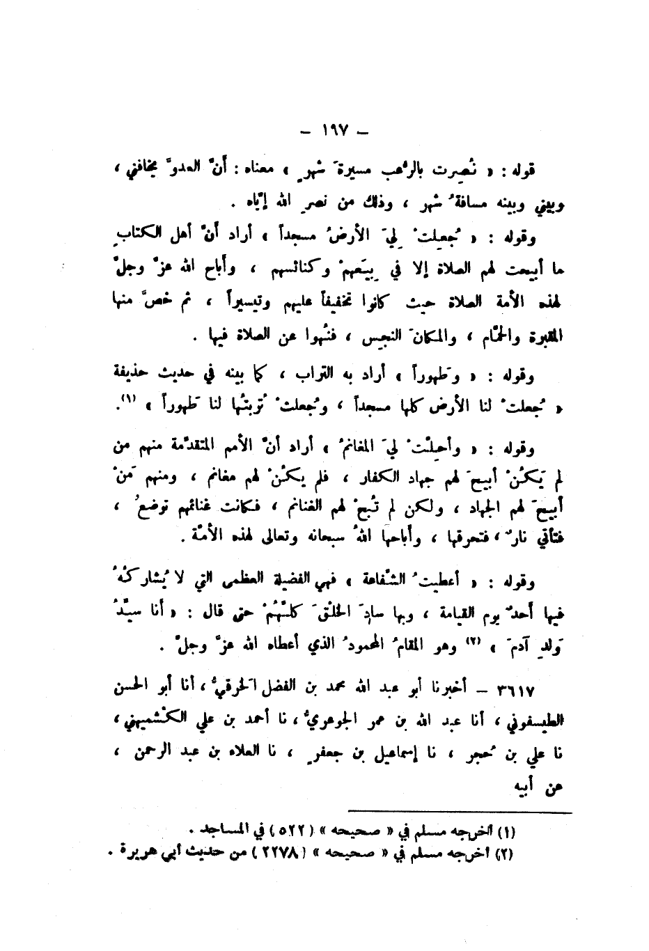 وَقَوله: «جعلت لي الأَرْض مَسْجِدا»، أَرَادَ أَن أهل الْكتاب مَا أبيحت لَهُم الصَّلَاة إِلَّا فِي بيعهم وكنائسهم، وأباح اللَّه عز وَجل لهَذِهِ الْأمة الصَّلَاة حَيْثُ كَانُوا تَخْفِيفًا عَلَيْهِم وتيسيرا، ثُمَّ خص مِنْهَا الْمقْبرَة وَالْحمام، وَالْمَكَان النَّجس، فنهوا عَن الصَّلَاة فِيهَا.