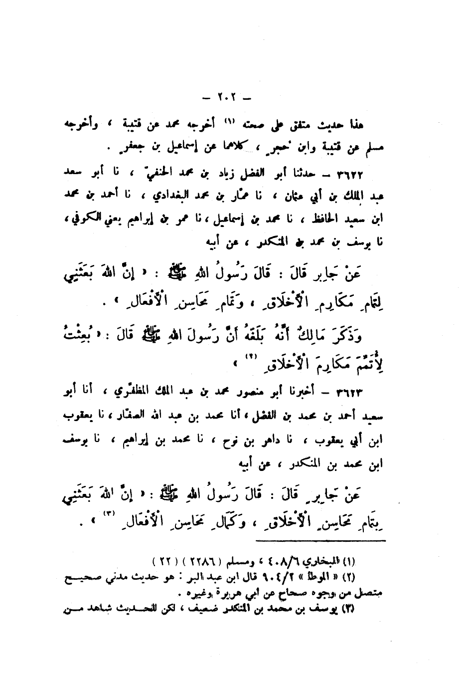3622 - حَدَّثَنَا أَبُو الْفَضْلِ زِيَادُ بْنُ مُحَمَّدٍ الْحَنَفِيُّ، نَا أَبُو سَعْدٍ عَبْدُ الْمَلِكِ بْنُ أَبِي عُثْمَانَ، نَا عَمَّارُ بْنُ مُحَمَّدٍ الْبَغْدَادِيُّ، نَا أَحْمَدُ بْنُ مُحَمَّدِ بْنِ سَعِيدٍ الْحَافِظُ، نَا مُحَمَّدُ بْنُ إِسْمَاعِيلَ، نَا عُمَرُ بْنُ إِبْرَاهِيمَ، يَعْنِي الْكُوفِيَّ، نَا يُوسُفُ بْنُ مُحَمَّدِ بْنِ الْمُنْكَدِرِ، عَنْ أَبِيهِ، عَنْ جَابِرٍ، قَالَ: قَالَ رَسُولُ اللَّهِ صَلَّى اللهُ عَلَيْهِ وَسَلَّمَ: «إِنَّ اللَّهَ بَعَثَنِي لِتَمَامِ مَكَارِمِ الأَخْلاقِ، وَتَمَامِ مَحَاسِنِ الأفْعَالِ»، وَذَكَرَ مَالِكٌ: أَنَّهُ بَلَغَهُ، أَنَّ رَسُولَ اللَّهِ صَلَّى اللهُ عَلَيْهِ وَسَلَّمَ قَالَ: «بُعِثْتُ لأُتَمِّمَ مَكَارِمَ الأَخْلاقِ»