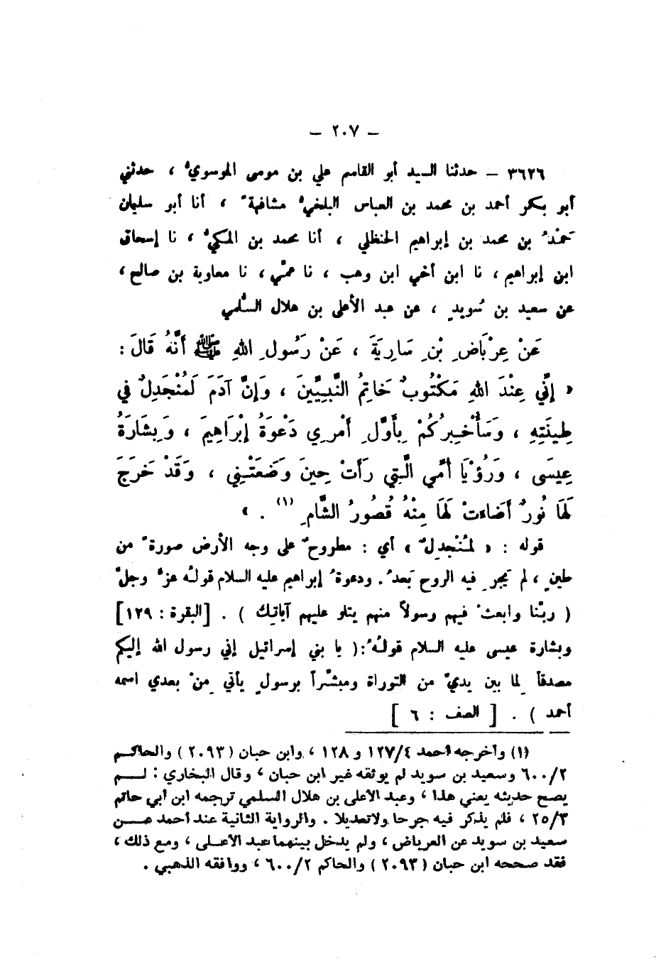 3626 - حَدَّثَنَا السَّيِّدُ أَبُو الْقَاسِمِ عَلِيُّ بْنُ مُوسَى الْمُوسَوِيُّ، حَدَّثَنِي أَبُو بَكْرٍ أَحْمَدُ بْنُ مُحَمَّدِ بْنِ الْعَبَّاسِ الْبَلْخِيُّ، مُشَافَهَةً، أَنا أَبُو سُلَيْمَانَ حَمْدُ بْنُ مُحَمَّدِ بْنِ إِبْرَاهِيمَ الْحَنْظَلِيُّ، أَنا مُحَمَّدُ بْنُ الْمَكِّيِّ، نَا إِسْحَاقُ بْنُ إِبْرَاهِيمَ، نَا ابْنُ أَخِي ابْنِ وَهْبٍ، نَا عَمِّي، نَا مُعَاوِيَةُ بْنُ صَالِحٍ، عَنْ سَعِيدِ بْنِ سُوَيْدٍ، عَنْ عَبْدِ الأَعْلَى بْنِ هِلالٍ السُّلَمِيِّ، عَنْ عِرْبَاضِ بْنِ سَارِيَةَ، عَنْ رَسُولِ اللَّهِ صَلَّى اللهُ عَلَيْهِ وَسَلَّمَ، أَنَّهُ قَالَ: " إِنِّي عِنْدَ اللَّهِ مَكْتُوبٌ خَاتِمُ النَّبِيِّينَ، وَإِنَّ آدَمَ لَمُنْجَدِلٌ فِي طِينَتِهِ، وَسَأُخْبِرُكُمْ بِأَوَّلِ أَمْرِي: دَعْوَةُ إِبْرَاهِيمَ، وَبِشَارَةُ عِيسَى، وَرُؤْيَا أُمِّي الَّتِي رَأَتْ حِينَ وَضَعَتْنِي، وَقَدْ خَرَجَ لَهَا نُورٌ أَضَاءَتْ لَهَا مِنْهُ قُصُورُ الشَّامِ "