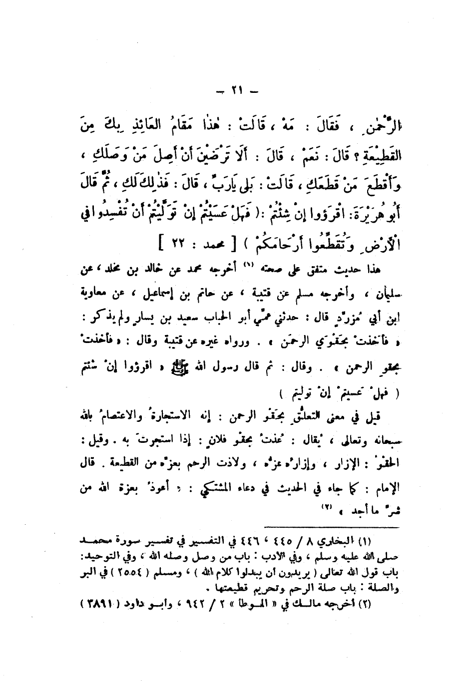 ثُمَّ قَالَ أَبُو هُرَيْرَةَ: اقْرَءُوا إِنْ شِئْتُمْ: {فَهَلْ عَسَيْتُمْ إِنْ تَوَلَّيْتُمْ أَنْ تُفْسِدُوا فِي الأَرْضِ وَتُقَطِّعُوا أَرْحَامَكُمْ} [مُحَمَّد: 22] ".