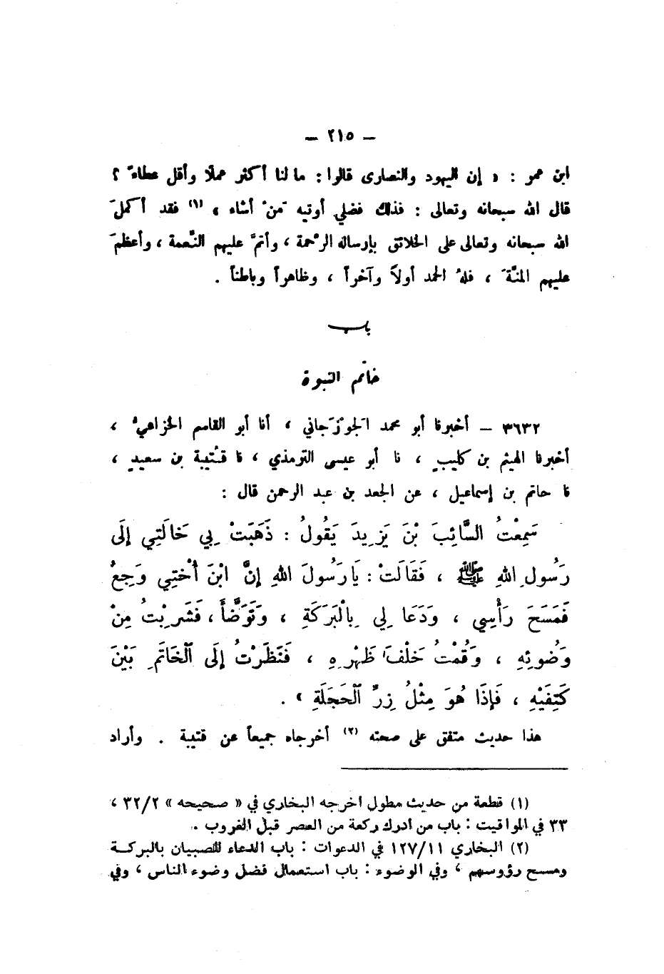 3632 - أَخْبَرَنَا أَبُو مُحَمَّدٍ الْجَوْزَجَانِيُّ، أَنا أَبُو الْقَاسِمِ الْخُزَاعِيُّ، أَخْبَرَنَا الْهَيْثَمُ بْنُ كُلَيْبٍ، نَا أَبُو عِيسَى التِّرْمِذِيُّ، نَا قُتَيْبَةُ بْنُ سَعْدٍ، نَا حَاتِمُ بْنُ إِسْمَاعِيلَ، عَنِ الْجَعْدِ بْنِ عَبْدِ الرَّحْمَنِ، قَالَ: سَمِعْتُ السَّائِبَ بْنَ يَزِيدَ، يَقُولُ: " ذَهَبَتْ بِي خَالَتِي إِلَى رَسُولِ اللَّهِ صَلَّى اللهُ عَلَيْهِ وَسَلَّمَ، فَقَالَتْ: يَا رَسُولَ اللَّهِ، إِنَّ ابْنَ أُخْتِي وَجِعٌ، فَمَسَحَ رَأْسِي، وَدَعَا لِي بِالْبَرَكَةِ، وَتَوَضَّأَ، فَشَرِبْتُ مِنْ وَضُوئِهِ، وَقُمْتُ خَلْفَ ظَهْرِهِ، فَنَظَرْتُ إِلَى الْخَاتَمِ بَيْنَ كَتِفَيْهِ، فَإِذَا هُوَ مِثْلُ زِرِّ الْحَجَلَةِ ".