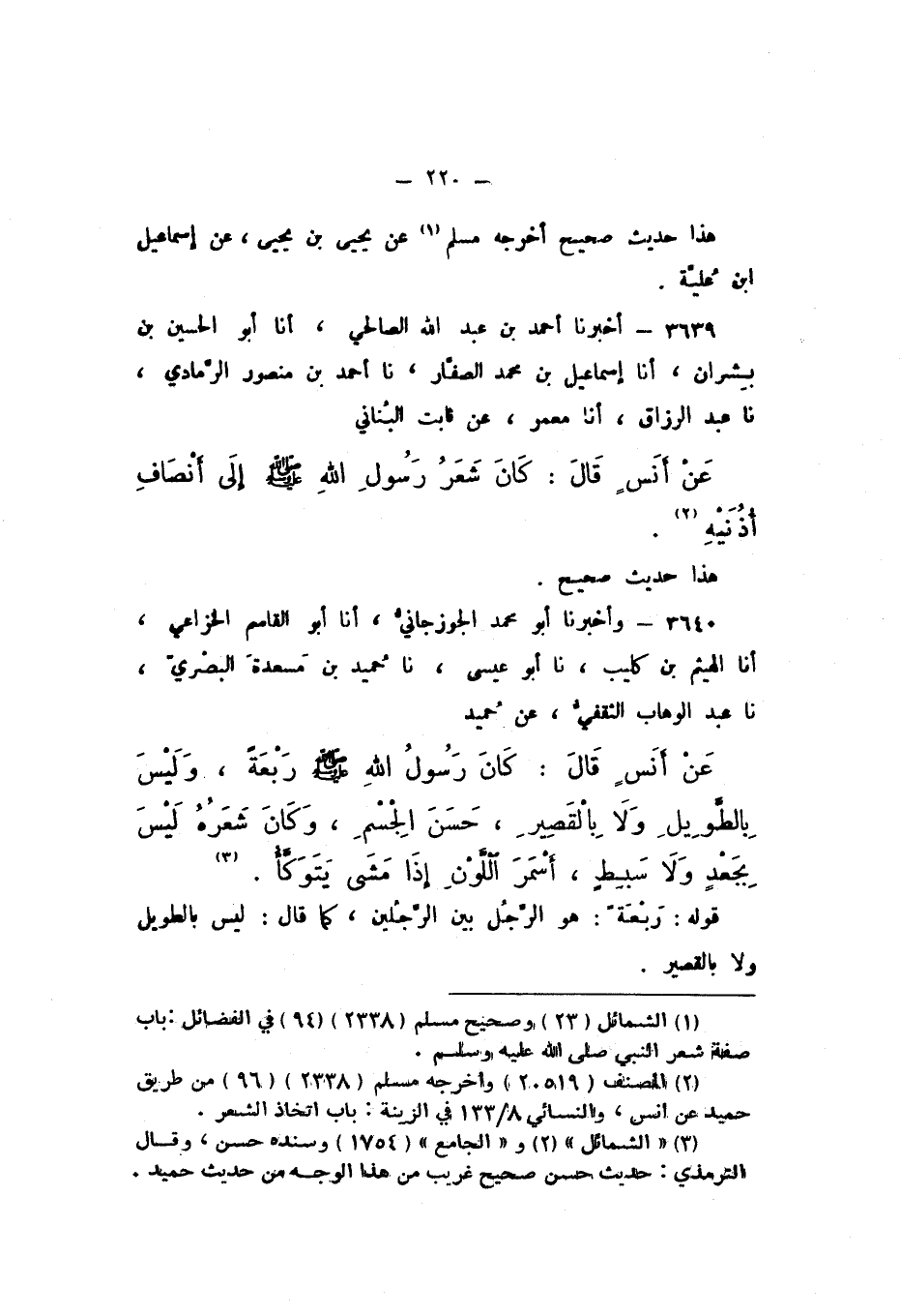 3640 - وَأَخْبَرَنَا أَبُو مُحَمَّدٍ الْجَوْزَجَانِيُّ، أَنا أَبُو الْقَاسِمِ الْخُزَاعِيُّ، أَنا الْهَيْثَمُ بْنُ كُلَيْبٍ، نَا أَبُو عِيسَى، نَا حُمَيْدُ بْنُ مَسْعَدَةَ الْبَصْرِيُّ، نَا عَبْدُ الْوَهَّابِ الثَّقَفِيُّ، عَنْ حُمَيْدٍ، عَنْ أَنَسٍ، قَالَ: «كَانَ رَسُولُ اللَّهِ صَلَّى اللهُ عَلَيْهِ وَسَلَّمَ رَبْعَةً، وَلَيْسَ بِالطَّوِيلِ وَلا بِالْقَصِيرِ، حَسَنَ الْجِسْمِ، وَكَانَ شَعَرُهُ لَيْسَ بِجَعْدٍ وَلا سَبْطٍ، أَسْمَرَ اللَّوْنِ، إِذَا مَشَى يَتَوَكَّأُ»