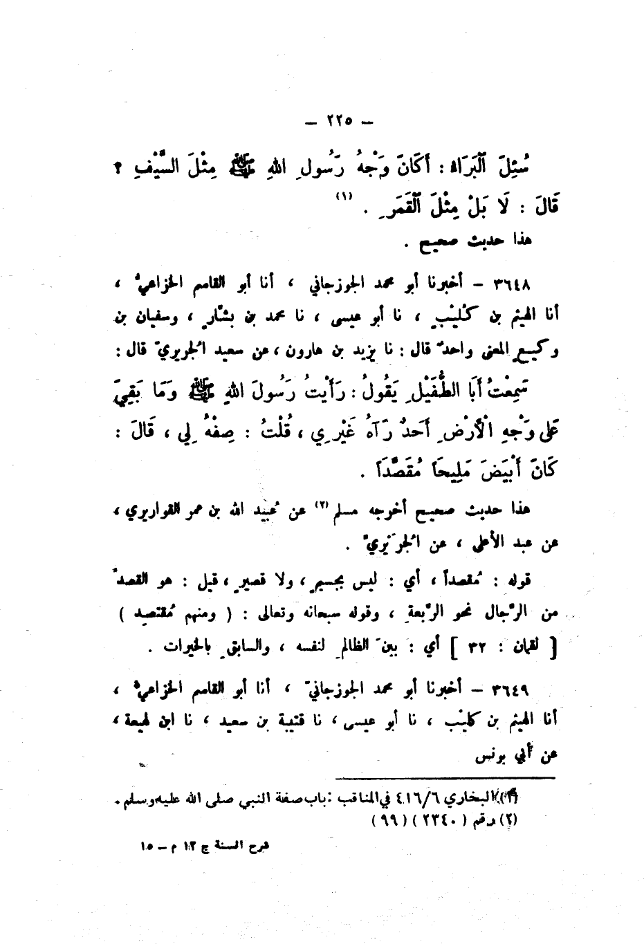 3648 - أَخْبَرَنَا أَبُو مُحَمَّدٍ الْجَوْزَجَانِيُّ، أَنا أَبُو الْقَاسِمِ الْخُزَاعِيُّ، أَنا الْهَيْثَمُ بْنُ كُلَيْبٍ، نَا أَبُو عِيسَى، نَا مُحَمَّدُ بْنُ بَشَّارٍ، وَسُفْيَانُ بْنُ وَكِيعٍ، الْمَعْنَى وَاحِدٌ، قَالَ: نَا يَزِيدُ بْنُ هَارُونَ، عَنْ سَعِيدٍ الْجُرَيْرِيِّ، قَالَ: سَمِعْتُ أَبَا الطُّفَيْلِ، يَقُولُ: " رَأَيْتُ رَسُولَ اللَّهِ صَلَّى اللهُ عَلَيْهِ وَسَلَّمَ وَمَا بَقِيَ عَلَى وَجْهِ الأَرْضِ أَحَدٌ رَآهُ غَيْرِي، قُلْتُ: صِفْهُ لِي، قَالَ: كَانَ أَبْيَضَ مَلِيحًا مُقَصَّدًا ".