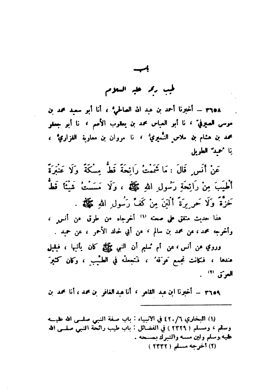 3658 - أَخْبَرَنَا أَحْمَدُ بْنُ عَبْدِ اللَّهِ الصَّالِحِيُّ، أَنا أَبُو سَعِيدٍ مُحَمَّدُ بْنُ مُوسَى الصَّيْرَفِيُّ، نَا أَبُو الْعَبَّاسِ مُحَمَّدُ بْنُ يَعْقُوبَ الأَصَمُّ، نَا أَبُو جَعْفَرٍ مُحَمَّدُ بْنُ هِشَامِ بْنِ مِلاسٍ النُّمَيْرِيُّ، نَا مَرْوَانُ بْنُ مُعَاوِيَةَ الْفَزَارِيُّ، نَا حُمَيْدٌ الطَّوِيلُ، عَنْ أَنَسٍ، قَالَ: «مَا شَمَمْتُ رَائِحَةً قَطُّ مِسْكَةً وَلا عَنْبَرَةً أَطْيَبَ مِنْ رَائِحَةِ رَسُولِ اللَّهِ صَلَّى اللهُ عَلَيْهِ وَسَلَّمَ، وَلا مَسَسْتُ شَيْئًا قَطُّ خَزَّةً، وَلا حَرِيرَةً أَلْيَنَ مِنْ كَفِّ رَسُولِ اللَّهِ صَلَّى اللهُ عَلَيْهِ وَسَلَّمَ».