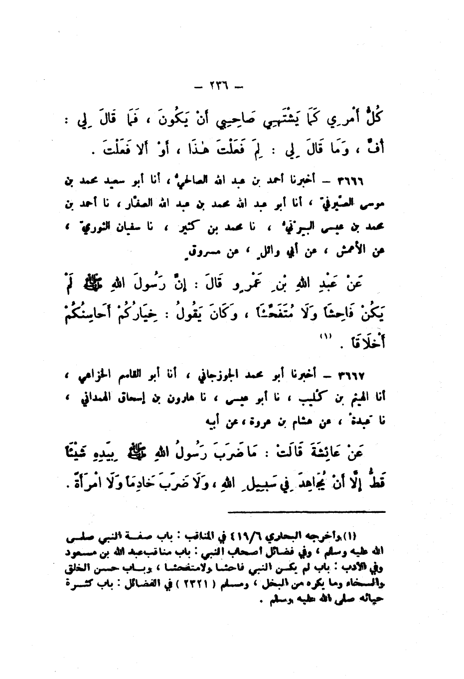 3666 - أَخْبَرَنَا أَحْمَدُ بْنُ عَبْدِ اللَّهِ الصَّالِحِيُّ، أَنا أَبُو سَعِيدٍ مُحَمَّدُ بْنُ مُوسَى الصَّيْرَفِيُّ، أَنا أَبُو عَبْدِ اللَّهِ مُحَمَّدُ بْنُ عَبْدِ اللَّهِ الصَّفَّارُ، نَا أَحْمَدُ بْنُ مُحَمَّدِ بْنِ عِيسَى الْبَرْتِيُّ، نَا مُحَمَّدُ بْنُ كَثِيرٍ، نَا سُفْيَانُ الثَّوْرِيُّ، عَنِ الأَعْمَشِ، عَنْ أَبِي وَائِلٍ، عَنْ مَسْرُوقٍ، عَنْ عَبْدِ اللَّهِ بْنِ عَمْرٍو، قَالَ: " إِنَّ رَسُولَ اللَّهِ صَلَّى اللهُ عَلَيْهِ وَسَلَّمَ لَمْ يَكُنْ فَاحِشًا وَلا مُتَفَحِّشًا، وَكَانَ يَقُولُ: خِيَارُكُمْ أَحَاسِنُكُمْ أَخْلاقًا "