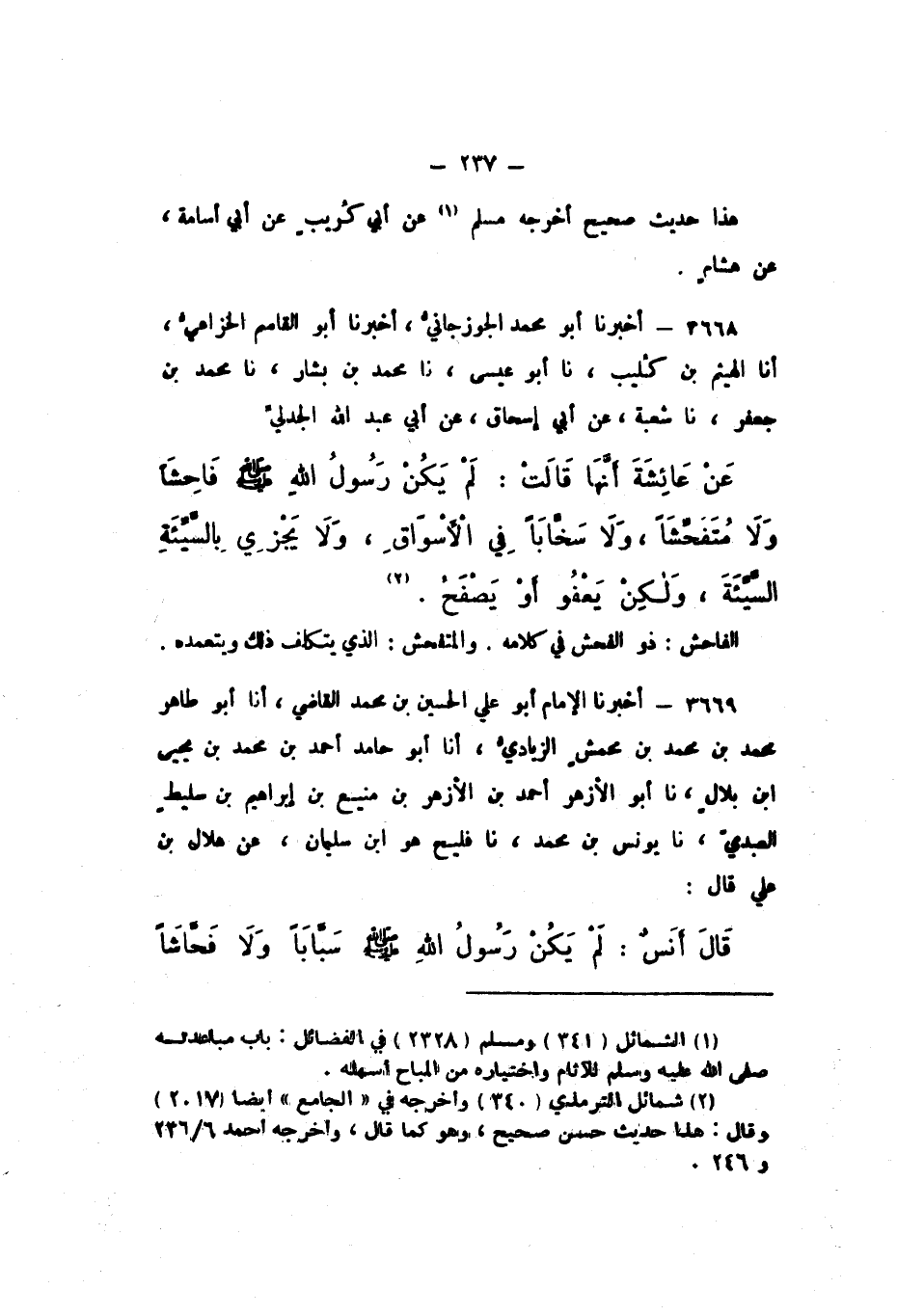 3668 - أَخْبَرَنَا أَبُو مُحَمَّدٍ الْجَوْزَجَانِيُّ، أَخْبَرَنَا أَبُو الْقَاسِمِ الْخُزَاعِيُّ، أَنا الْهَيْثَمُ بْنُ كُلَيْبٍ، أَنا أَبُو عِيسَى، نَا مُحَمَّدُ بْنُ بَشَّارٍ، نَا مُحَمَّدُ بْنُ جَعْفَرٍ، نَا شُعْبَةُ، عَنْ أَبِي إِسْحَاقَ، عَنْ أَبِي عَبْدِ اللَّهِ الْجَدَلِيِّ، عَنْ عَائِشَةَ، أَنَّهَا قَالَتْ: «لَمْ يَكُنْ رَسُولُ اللَّهِ صَلَّى اللهُ عَلَيْهِ وَسَلَّمَ فَاحِشًا وَلا مُتَفَحِّشًا، وَلا سَخَّابًا فِي الأَسْوَاقِ، وَلا يَجْزِي بِالسَّيِّئَةِ السَّيِّئَةَ، وَلَكِنْ يَعْفُو أَوْ يَصْفَحُ»