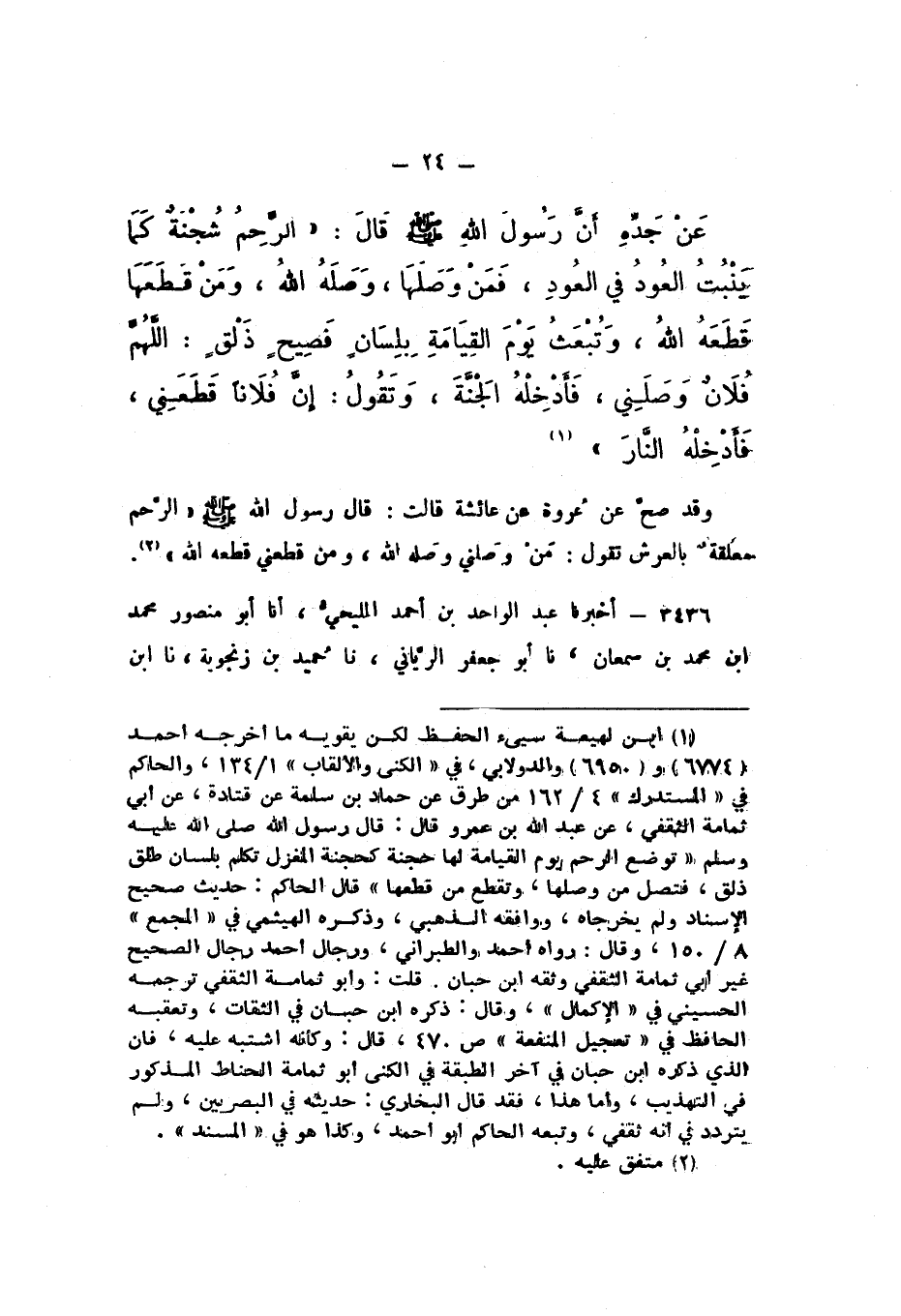 وَقَدْ صَحَّ عَنْ عُرْوَةَ، عَنْ عَائِشَةَ، قَالَتْ: قَالَ رَسُول اللَّهِ صَلَّى اللهُ عَلَيْهِ وَسَلَّمَ: " الرَّحِمُ مُعَلَّقَةٌ بِالْعَرْشِ، تَقُولُ: مَنْ وَصَلَنِي وَصَلَهُ اللَّهُ، وَمَنْ قَطَعَنِي قَطَعَهُ اللَّهُ ".
