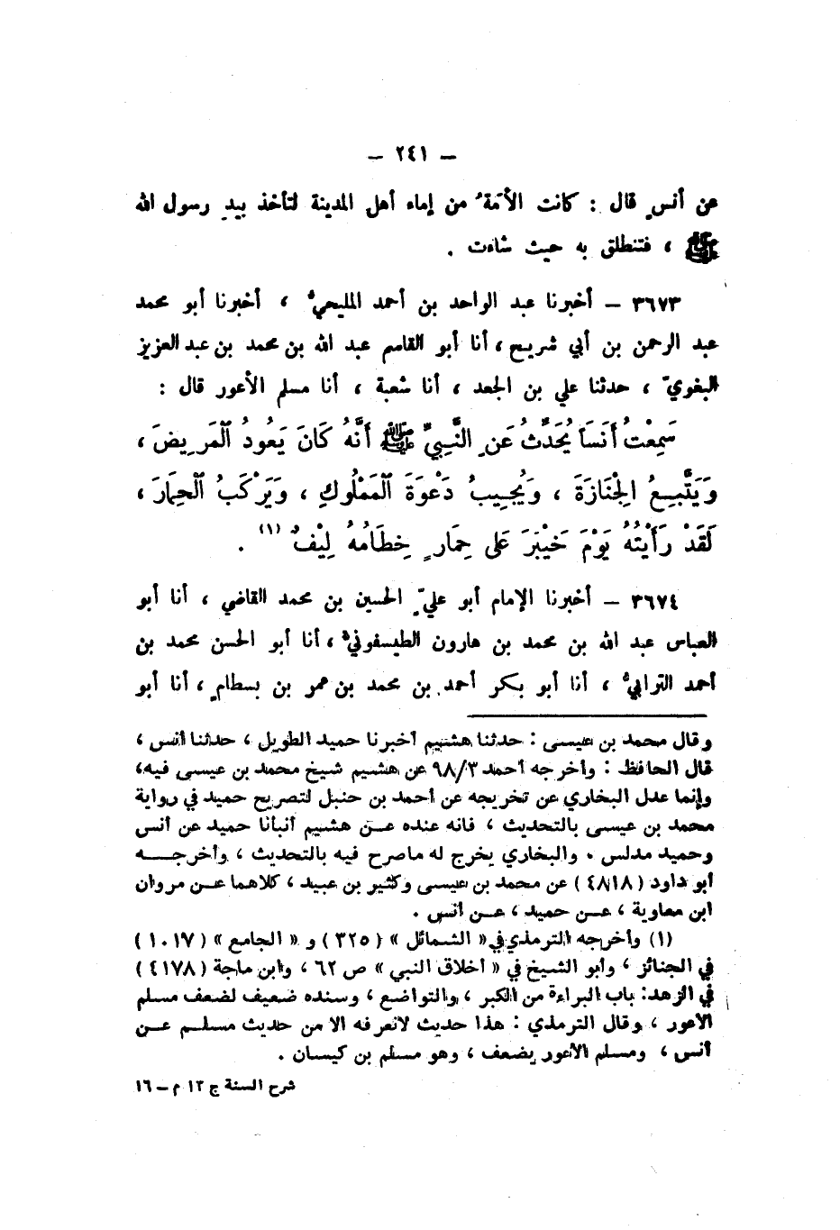 3673 - أَخْبَرَنَا عَبْدُ الْوَاحِدِ بْنُ أَحْمَدَ الْمَلِيحِيُّ، أَخْبَرَنَا أَبُو مُحَمَّدٍ عَبْدُ الرَّحْمَنِ بْنُ أَبِي شُرَيْحٍ , أَنا أَبُو الْقَاسِمِ عَبْدُ اللَّهِ بْنُ مُحَمَّدِ بْنِ عَبْدِ الْعَزِيزِ الْبَغَوِيُّ، حَدَّثَنَا عَلِيُّ بْنُ الْجَعْدِ، أَنا شُعْبَةُ، أَنا مُسْلِمٌ الأَعْوَرُ، قَالَ: سَمِعْتُ أَنَسًا، يُحَدِّثُ عَنِ النَّبِيِّ صَلَّى اللهُ عَلَيْهِ وَسَلَّمَ، «أَنَّهُ كَانَ يَعُودُ الْمَرِيضَ، وَيَتَّبِعُ الْجِنَازَةَ، وَيُجِيبُ دَعْوَةَ الْمَمْلُوكِ، وَيَرْكَبُ الْحِمَارَ، لَقَدْ رَأَيْتُهُ يَوْمَ خَيْبَرَ عَلَى حِمَارٍ خِطَامُهُ لِيفٌ»