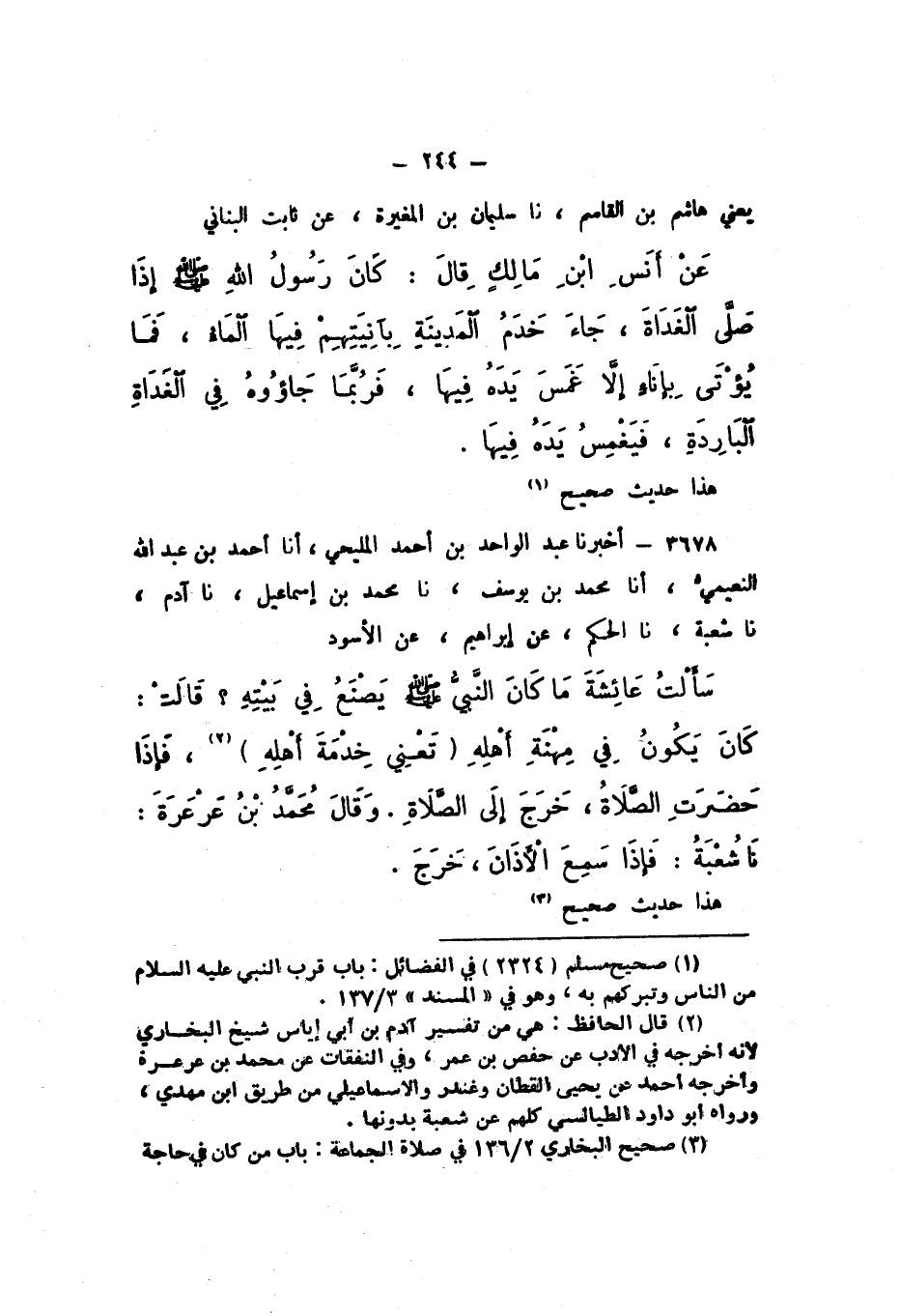 3678 - أَخْبَرَنَا عَبْدُ الْوَاحِدِ بْنُ أَحْمَدَ الْمَلِيحِيُّ، أَنا أَحْمَدُ بْنُ عَبْدِ اللَّهِ النُّعَيْمِيُّ، أَنا مُحَمَّدُ بْنُ يُوسُفَ، نَا مُحَمَّدُ بْنُ إِسْمَاعِيلَ، نَا آدَمُ، نَا شُعْبَةُ، نَا الْحَكَمُ، عَنْ إِبْرَاهِيمَ، عَنِ الأَسْوَدِ، " سَأَلْتُ عَائِشَةَ مَا كَانَ النَّبِيُّ صَلَّى اللهُ عَلَيْهِ وَسَلَّمَ يَصْنَعُ فِي بَيْتِهِ؟ قَالَتْ: كَانَ يَكُونُ فِي مِهْنَةِ أَهْلِهِ، تَعْنِي خِدْمَةَ أَهْلِهِ، فَإِذَا حَضَرَتِ الصَّلاةُ، خَرَجَ إِلَى الصَّلاةِ ".