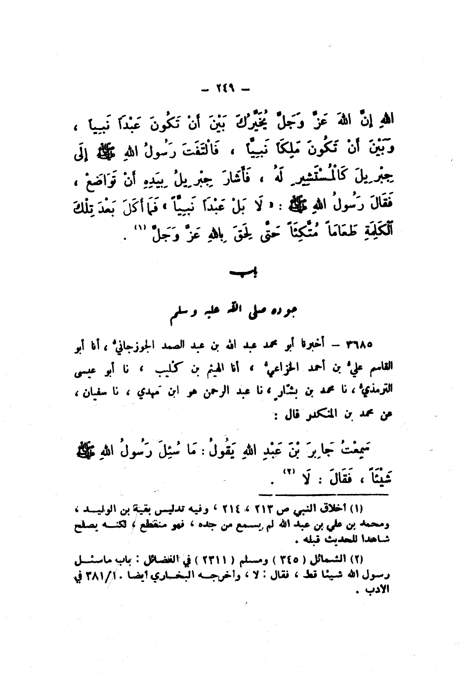 3685 - أَخْبَرَنَا أَبُو مُحَمَّدٍ عَبْدُ اللَّهِ بْنُ عَبْدِ الصَّمَدِ الْجَوْزَجَانِيُّ، أَنا أَبُو الْقَاسِمِ عَلِيُّ بْنُ أَحْمَدَ الْخُزَاعِيُّ، أَنا الْهَيْثَمُ بْنُ كُلَيْبٍ، نَا أَبُو عِيسَى التِّرْمِذِيُّ، نَا مُحَمَّدُ بْنُ بَشَّارٍ، نَا عَبْدُ الرَّحْمَنِ، هُوَ ابْنُ مَهْدِيٍّ، نَا سُفْيَانُ، عَنْ مُحَمَّدِ بْنِ الْمُنْكَدِرِ، قَالَ: سَمِعْتُ جَابِرَ بْنَ عَبْدِ اللَّهِ، يقُولُ: " مَا سُئِلَ رَسُولُ اللَّهِ صَلَّى اللهُ عَلَيْهِ وَسَلَّمَ شَيْئًا، فَقَالَ: لَا ".