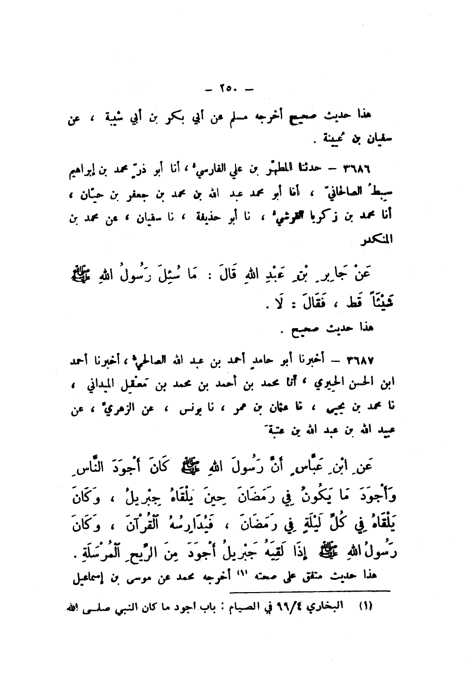 3686 - حَدَّثَنَا الْمُطَهَّرُ بْنُ عَلِيٍّ الْفَارِسِيُّ، أَنا أَبُو ذَرٍّ مُحَمَّدُ بْنُ إِبْرَاهِيمَ سِبْطُ الصَّالْحَانِيِّ، أَنا أَبُو مُحَمَّدٍ عَبْدُ اللَّهِ بْنُ مُحَمَّدِ بْنِ جَعْفَرِ بْنِ حَيَّانَ، أَنا مُحَمَّدُ بْنُ زَكَرِيَّا الْقُرَشِيُّ، نَا أَبُو حُذَيْفَةَ، نَا سُفْيَانُ، عَنْ مُحَمَّدِ بْنِ الْمُنْكَدِرِ، عَنْ جَابِرِ بْنِ عَبْدِ اللَّهِ، قَالَ: " مَا سُئِلَ رَسُولُ اللَّهِ صَلَّى اللهُ عَلَيْهِ وَسَلَّمَ شَيْئًا قَطُّ، فَقَالَ: لَا ".