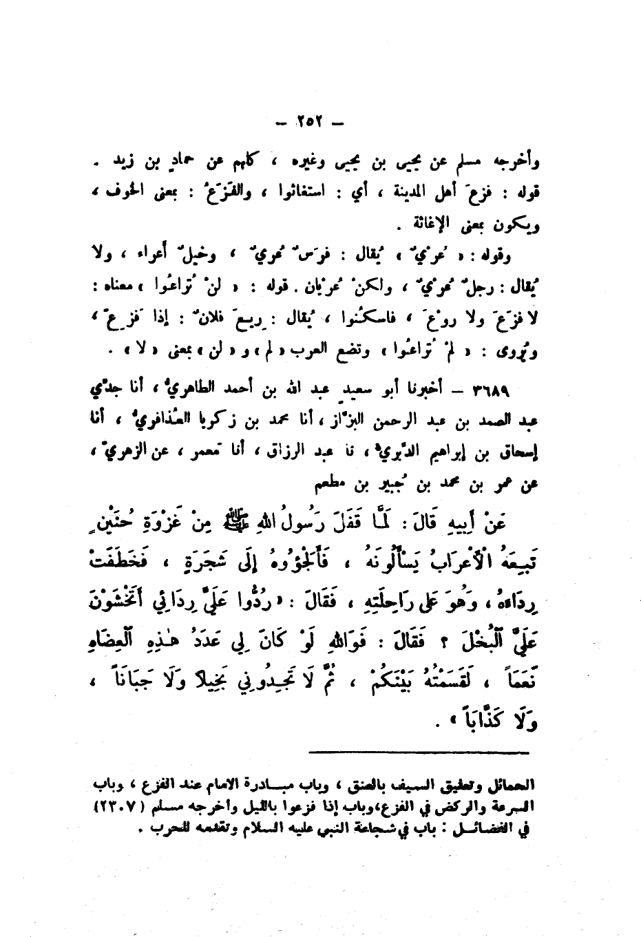 3689 - أَخْبَرَنَا أَبُو سَعِيدٍ عَبْدُ اللَّهِ بْنُ أَحْمَدَ الطَّاهِرِيُّ، أَنا جَدِّي عَبْدُ الصَّمَدِ بْنُ عَبْدِ الرَّحْمَنِ الْبَزَّازُ، أَنا مُحَمَّدُ بْنُ زَكَرِيَّا الْعَذَافِرِيُّ، أَنا إِسْحَاقُ بْنُ إِبْرَاهِيمَ الدَّبَرِيُّ، نَا عَبْدُ الرَّزَّاقِ، أَنا مَعْمَرٌ، عَنِ الزُّهْرِيِّ، عَنْ عُمَرَ بْنِ مُحَمَّدِ بْنِ جُبَيْرِ بْنِ مُطْعِمٍ، عَنْ أَبِيهِ، قَالَ: " لَمَّا قَفَلَ رَسُولُ اللَّهِ صَلَّى اللهُ عَلَيْهِ وَسَلَّمَ مِنْ غَزْوَةِ حُنَيْنٍ تَبِعَهُ الأَعْرَابُ يَسْأَلُونَهُ، فَأَلْجَئُوهُ إلَى شَجَرَةٍ، فَخَطَفَتْ رِدَاءَهُ، وَهُوَ عَلَى رَاحِلَتِهِ، فَقَالَ: رُدُّوا عَلَيَّ رِدَائِي، أَتخْشَوْنَ عَلَيَّ الْبُخْلَ؟ فَقَالَ: فَوَاللَّهِ لَوْ كَانَ لِي عَدَدُ هَذِهِ الْعِضَاهِ نَعَمًا، لَقَسَمْتُهُ بَيْنَكُمْ، ثُمَّ لَا تَجِدُونِي بَخِيلا، وَلا جَبَانًا، وَلا كَذَّابًا ".