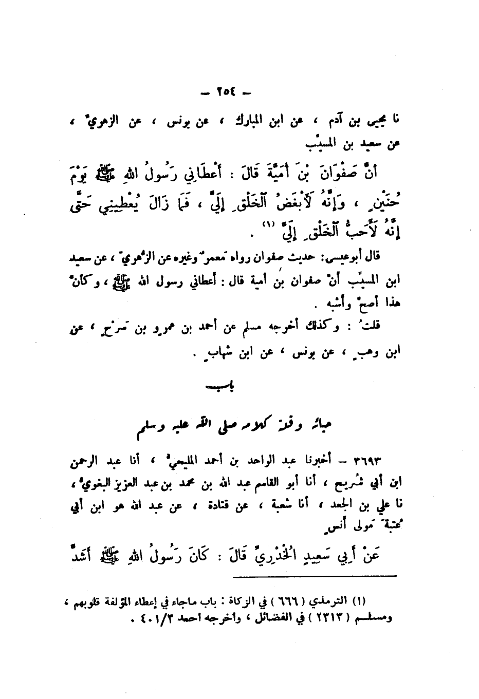 نَا يَحْيَى بْنُ آدَمَ، عَنِ ابْنِ الْمُبَارَكِ، عَنْ يُونُسَ، عَنِ الزُّهْرِيِّ، عَنْ سَعِيدِ بْنِ الْمُسَيِّبِ، أَنَّ صَفْوَانَ بْنَ أُمَيَّةَ قَالَ: «أَعْطَانِي رَسُولُ اللَّهِ صَلَّى اللهُ عَلَيْهِ وَسَلَّمَ يَوْمَ حُنَيْنٍ، وَإِنَّهُ لأَبْغَضُ الْخَلْقِ إِلَيَّ، فَمَا زَالَ يُعْطِينِي حَتَّى إِنَّهُ لأَحَبُّ الْخَلْقِ إِلَيَّ».
