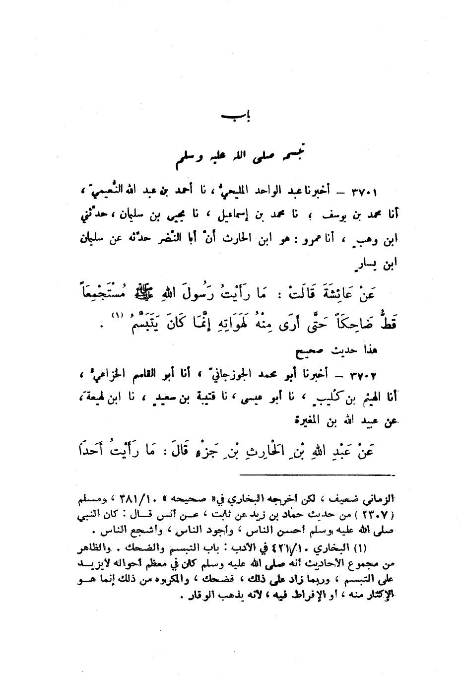 3701 - أَخْبَرَنَا عَبْدُ الْوَاحِدِ الْمَلِيحِيُّ، نَا أَحْمَدُ بْنُ عَبْدِ اللَّهِ النُّعَيْمِيُّ، أَنا مُحَمَّدُ بْنُ يُوسُفَ، نَا مُحَمَّدُ بْنُ إِسْمَاعِيلَ، نَا يَحْيَى بْنُ سُلَيْمَانَ، حَدَّثَنِي ابْنُ وَهْبٍ، أَنا عَمْرٌو، هُوَ ابْنُ الْحَارِثِ، أَنَّ أَبَا النَّضْرِ، حَدَّثَهُ، عَنْ سُلَيْمَانَ بْنِ يَسَارٍ، عَنْ عَائِشَةَ، قَالَتْ: «مَا رَأَيْتُ رَسُولَ اللَّهِ صَلَّى اللهُ عَلَيْهِ وَسَلَّمَ مُسْتَجْمِعًا قَطُّ ضَاحِكًا حَتَّى أَرَى مِنْهُ لَهَوَاتِهِ إِنَّمَا كَانَ يَتَبَسَّمُ».